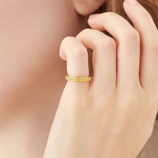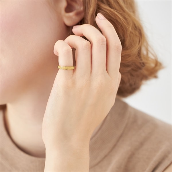 華やかにきらめくスターダスト加工がほどこされたピンキーリング。明るいイエローカラーを上品に仕上げたダスト加工がアクセントとなるデザイン。シンプルなストレートラインはどのようなスタイルともマッチし、お手持ちのリングとのコーディネートも楽しめます。※ボリューム(幅)のあるリングは、通常より着用時にサイズが小さく感じる場合がございます。
