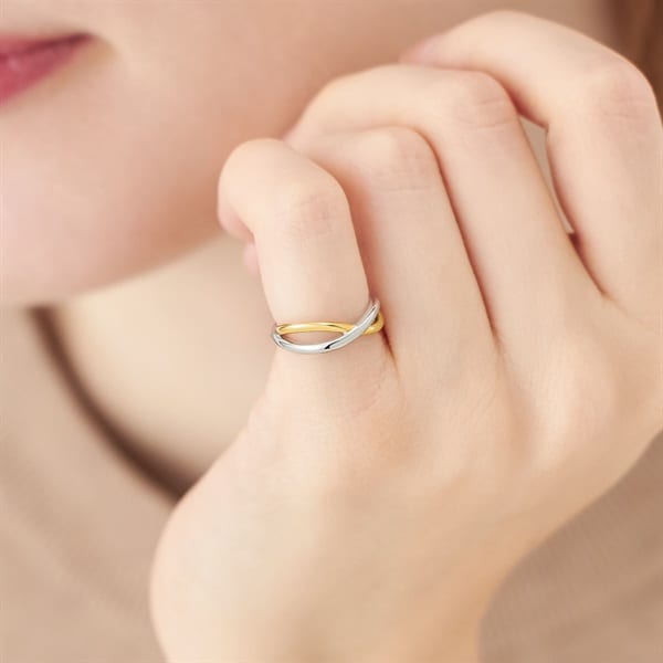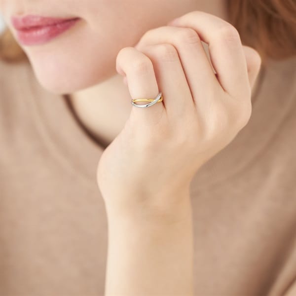 コンビカラーがアクセントのピンキーリング。地金のみのカジュアルな仕上がりで、日常使いにおすすめのデザイン。軽やかなラインがクロスした、抜け感が身に着けやすいアイテム。コンビカラーだからこそ、カラーを選ばす手元のコーディネートを楽しめます。※ボリューム(幅)のあるリングは、通常より着用時にサイズが小さく感じる場合がございます。