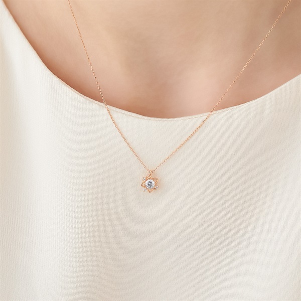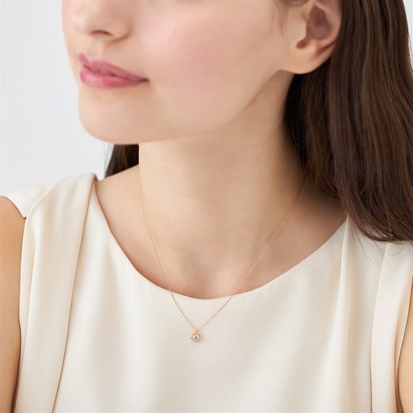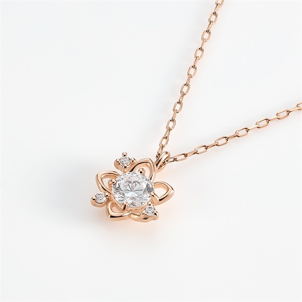 ストーンの輝きが華やかなフラワーモチーフのネックレス。アシンメトリーのシルエットが、自然体で身に着けやすい雰囲気を添えてくれるデザイン。幸福や美しさを意味するフラワーモチーフは大切な方へのギフトにもおすすめです