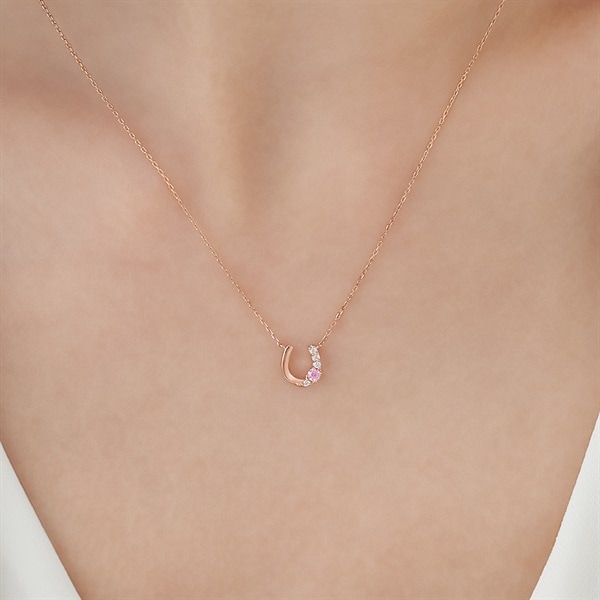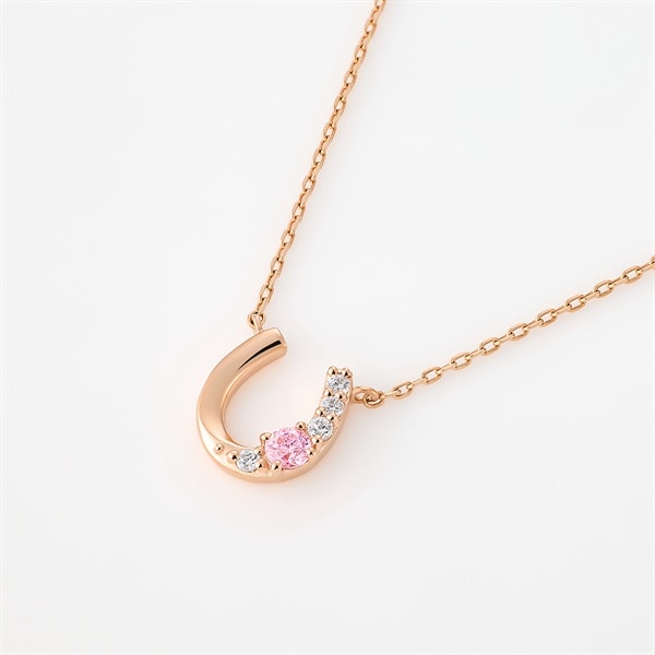 幸運を呼び込むと言われる馬蹄モチーフのネックレス。多数の輝くキュービックジルコニアの中に、1粒のピンクカラーのストーンを添えた可憐なデザイン。ピンクゴールドの優しい色合いが、キュービックジルコニアの輝きを一層美しく見せます。モチーフネックレスはご自身へのお守りや大切なかたへのギフトにもおすすめです。