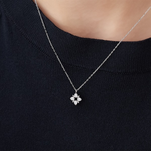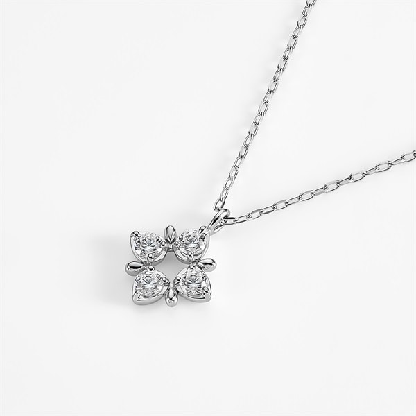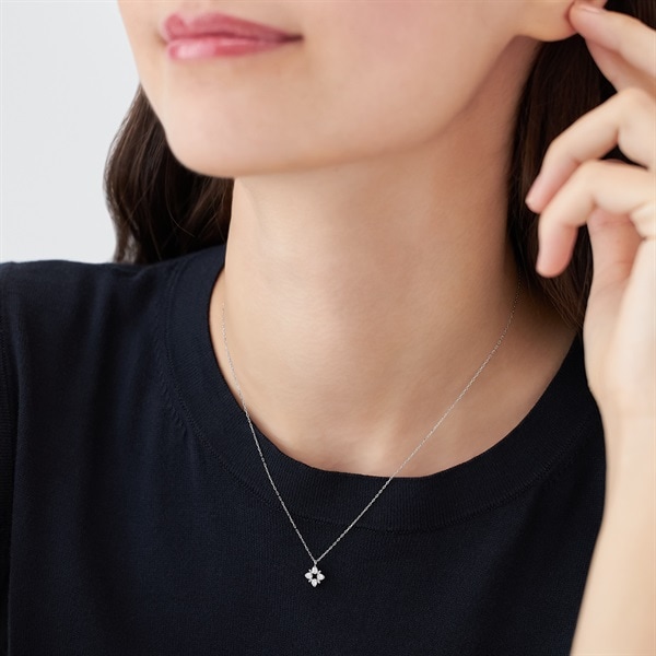 ストーンの輝きが華やかなフラワーモチーフのネックレス。4枚の花びらをシンメトリーに配したデザインは、オケージョンにもふさわしいきちんと感を演出してくれます。幸福や美しさを意味するフラワーモチーフは大切な方へのギフトにもおすすめです。