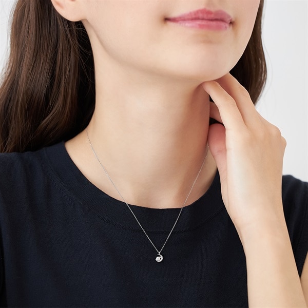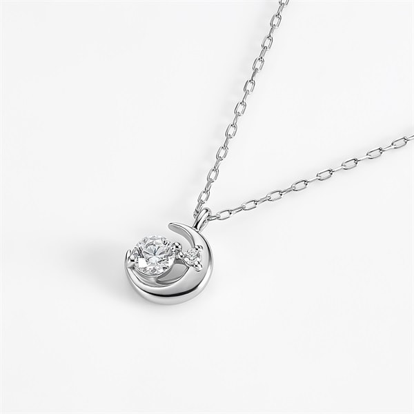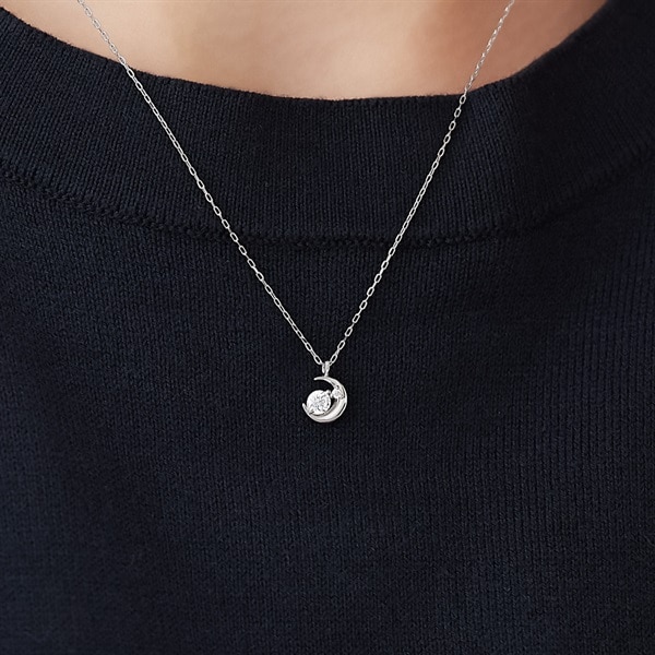 ストーンの輝きが華やかな月モチーフのネックレス。月のラインに映えるストーンの輝きが、胸元を明るく照らしてくれるデザイン。安らぎや優しさを意味するムーンモチーフは大切な方へのギフトにもおすすめです。
