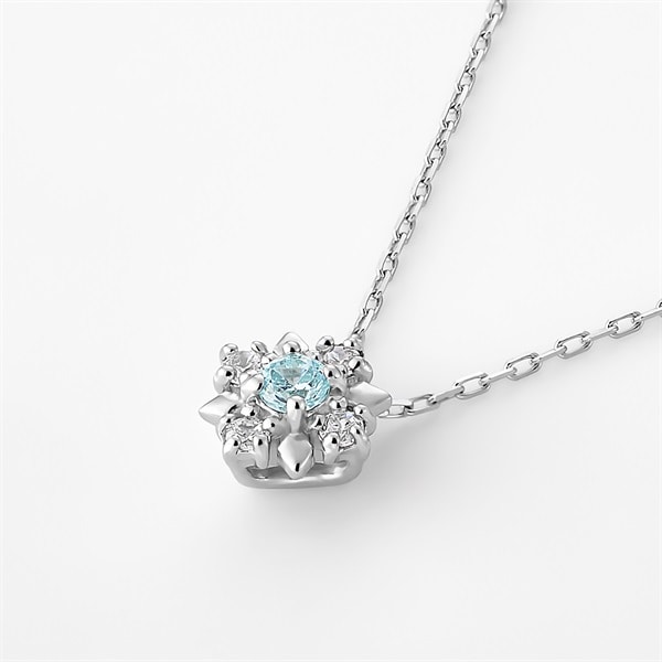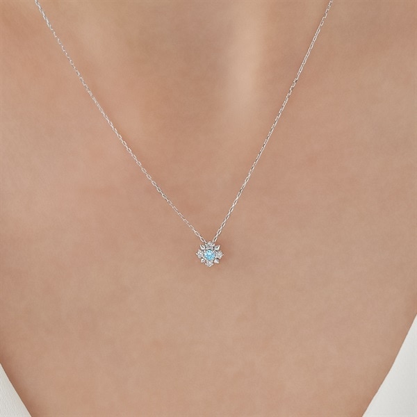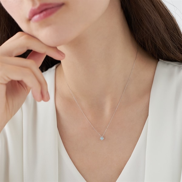星のように華やかにきらめくネックレス。4石のキュービックジルコニアに囲まれたブルーカラーのストーンが、凛とした輝きを放つデザイン。上品なサイズ感のネックレスはギフトにもおすすめです。