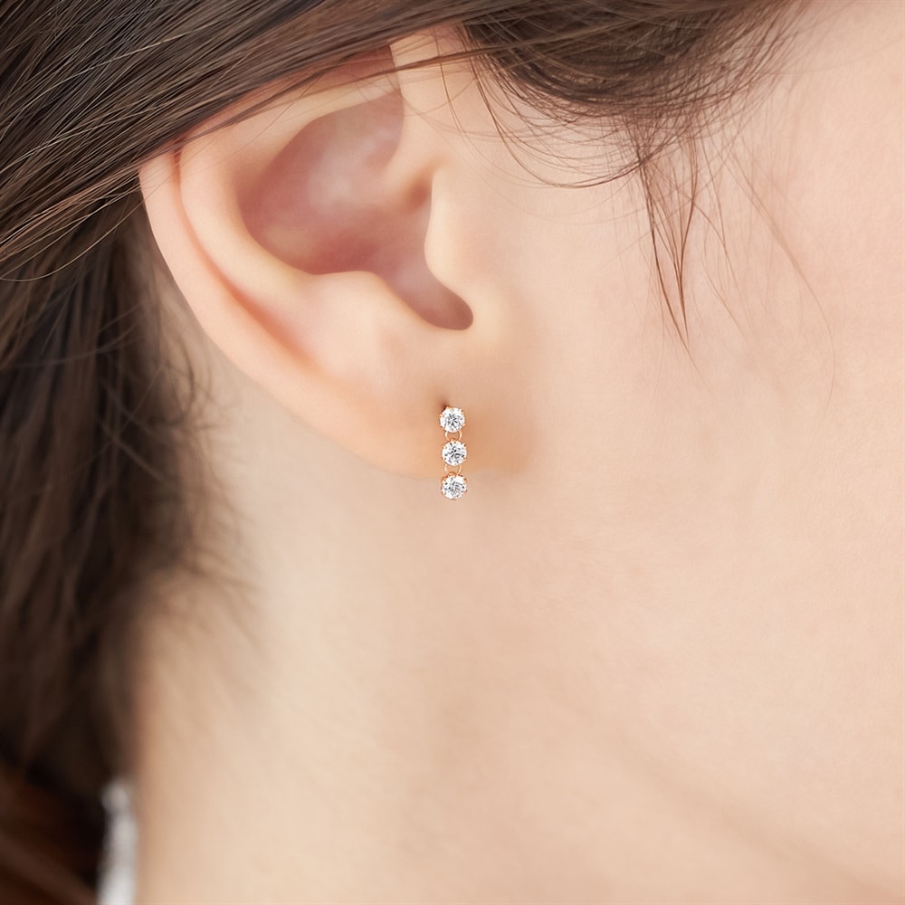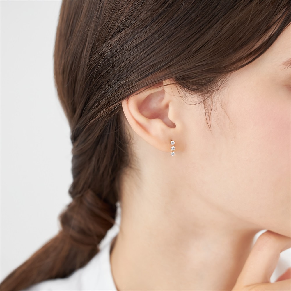動くたびにストーンがきらめく、3石デザインのピアス。ピンクゴールドカラーのやわらかな輝きが、顔周りを優しく上品な印象に仕上げます。シンプルで合わせやすいデザインのため、ご自身用にはもちろん、プレゼントにもおすすめです。