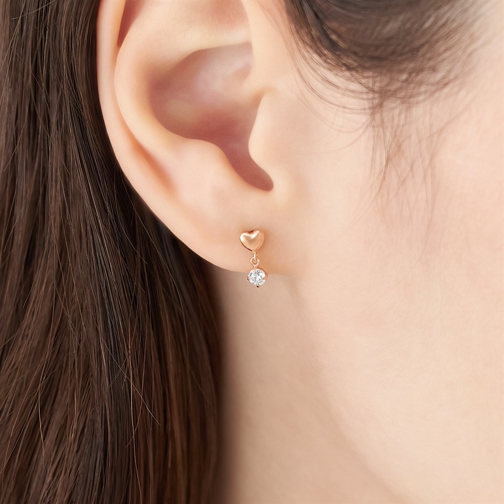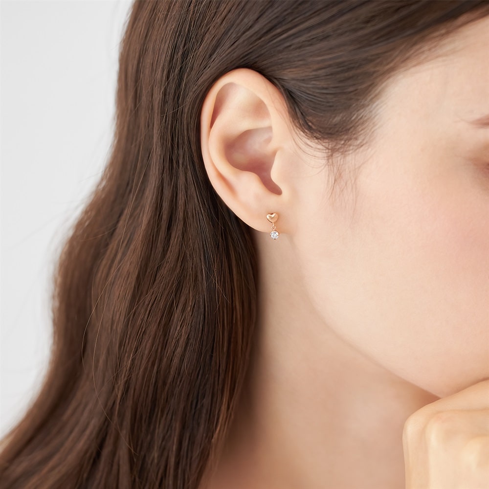 ぷちっとしたサイズ感のハートにきらめくストーンが揺れるピアス。ピンクゴールドカラーのやわらかな輝きが、顔周りを優しく彩ります。小ぶりで繊細なデザインのため、デイリーにも特別な日にも合わせやすく、ギフトにおすすめです。