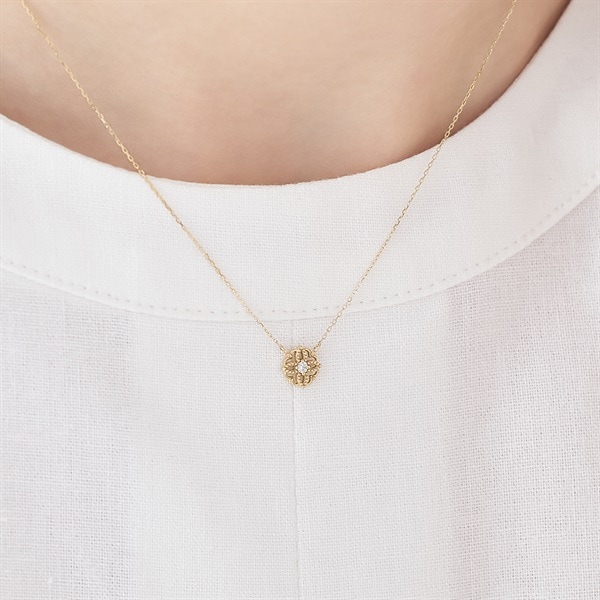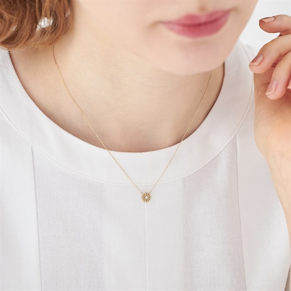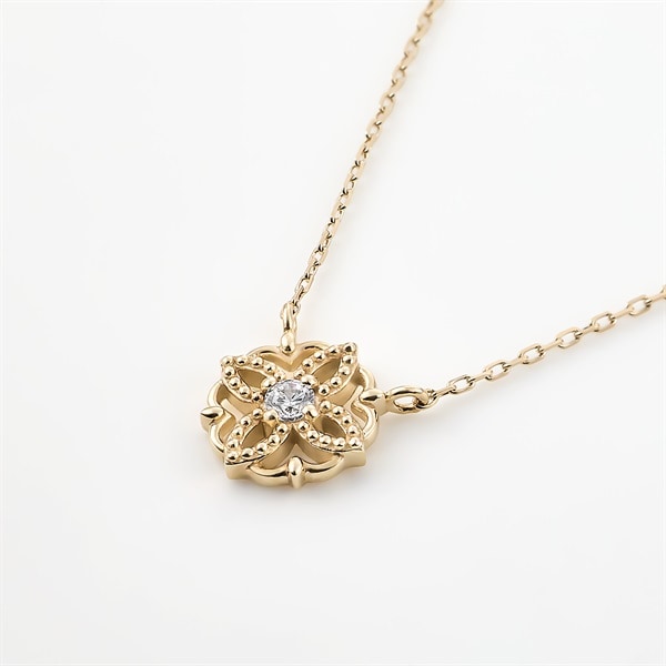 繊細な透かしをほどこしたクラシカルなネックレス。お花の装飾をイメージした可愛らしいデザインです。ご自身へのご褒美にも、大切な方へのギフトにもおすすめです。【K7-Classic Gold-】もっと多くの人々にゴールドを楽しんでいただきたいという思いから、Canal4℃が独自で配合して作り上げた、Classic Gold(クラシックゴールド)。通常のイエローゴールドに比べて、淡くやわらかさを感じるクラシックゴールドは、肌なじみが良く身に着けやすいカラーです。初めてイエローゴールドをお選びになられる方にも挑戦しやすく、ピンクゴールドがお好きな方にもおすすめなカラーです。