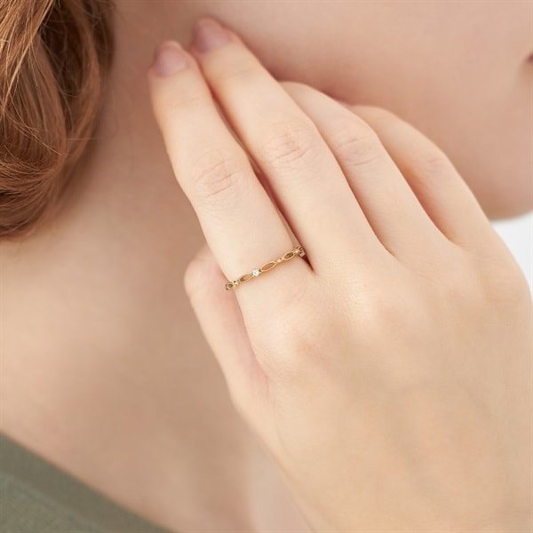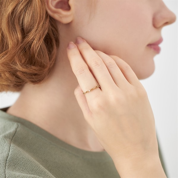 透かしをほどこしたクラシカルなリング。スタッズをイメージしたパーツがアクセントになっています。繊細で軽やかなフォルムは、1本でも他のリングとのレイヤードでもお使いいただけます。※ボリューム(幅)のあるリングは、通常より着用時にサイズが小さく感じる場合がございます。【K7-Classic Gold-】もっと多くの人々にゴールドを楽しんでいただきたいという思いから、Canal4℃が独自で配合して作り上げた、Classic Gold(クラシックゴールド)。通常のイエローゴールドに比べて、淡くやわらかさを感じるクラシックゴールドは、肌なじみが良く身に着けやすいカラーです。初めてイエローゴールドをお選びになられる方にも挑戦しやすく、ピンクゴールドがお好きな方にもおすすめなカラーです。