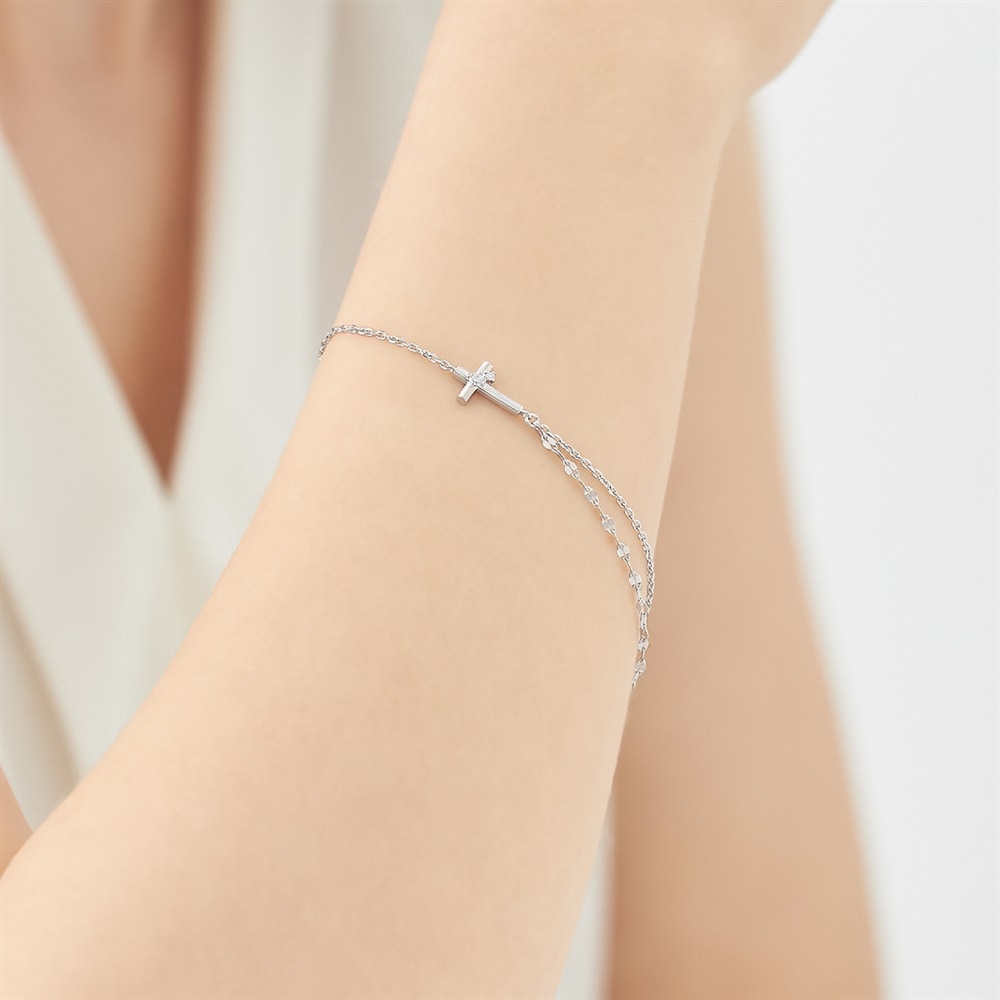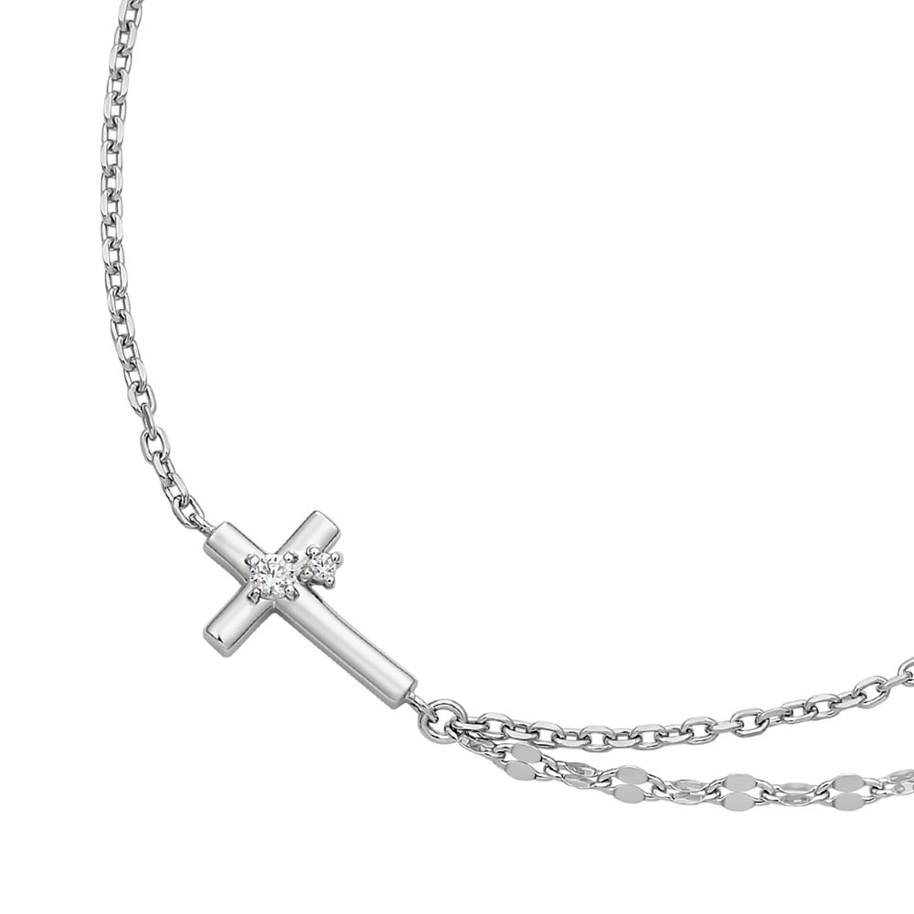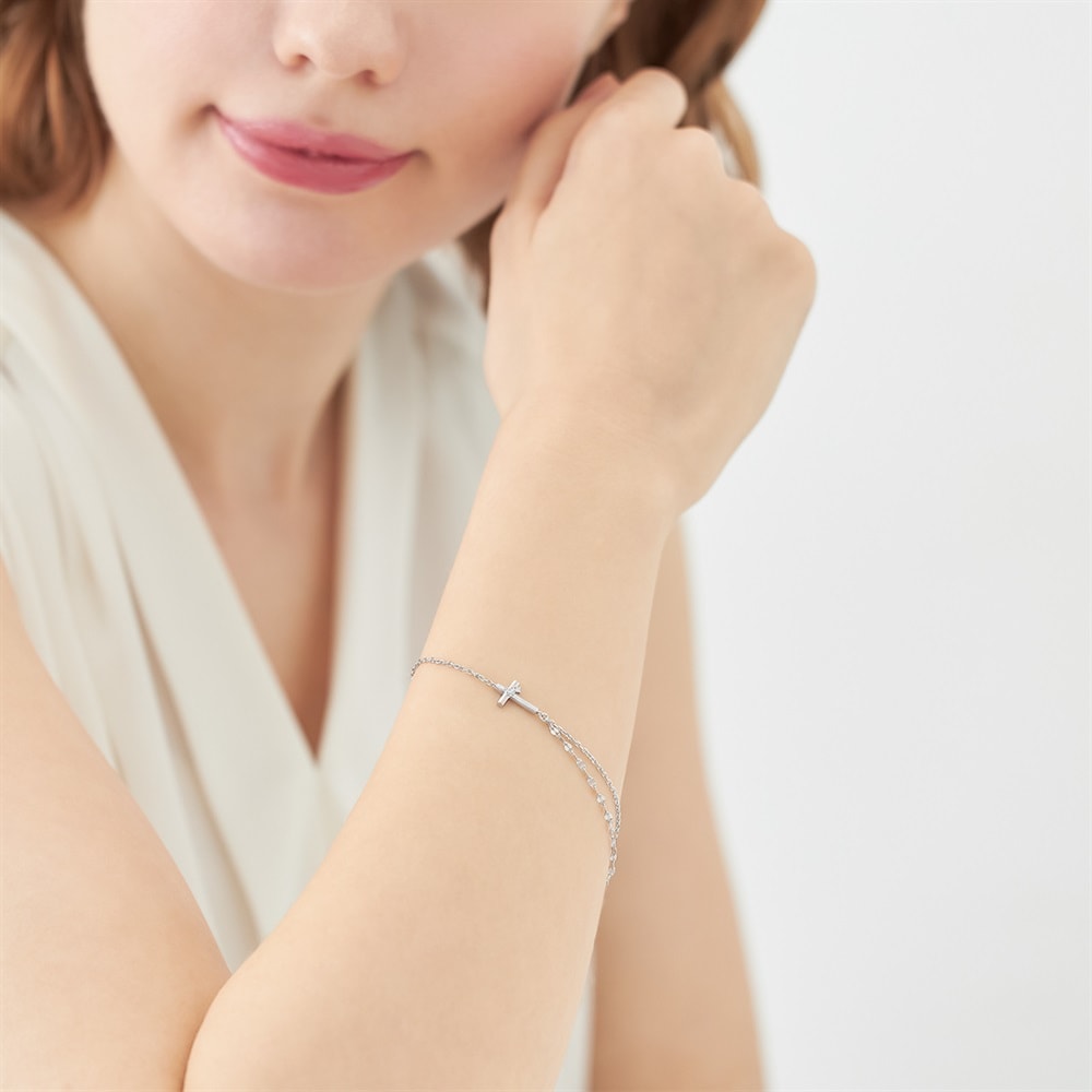 ロジウムカラーが上品なクロスモチーフのブレスレット。レイヤードのチェーンが揺れて手元に女性らしい華やかさをプラスするデザインです。クロスモチーフは「守護」「永遠」などを意味し、災いから身を守るお守りとして古くから愛されています。ご自身のご褒美やプレゼントにもおすすめのアイテムです。