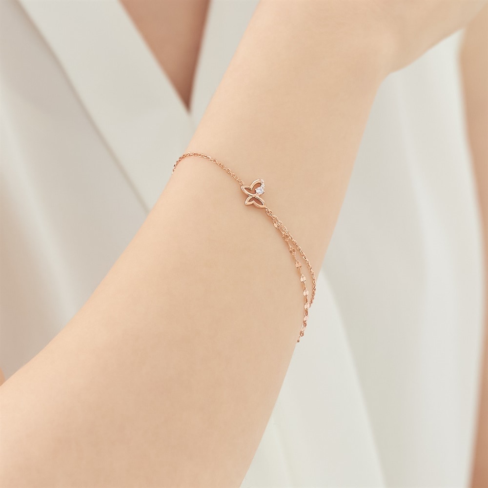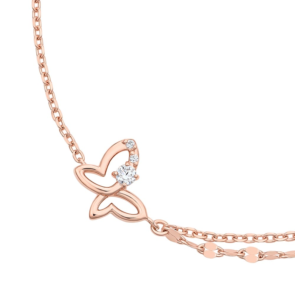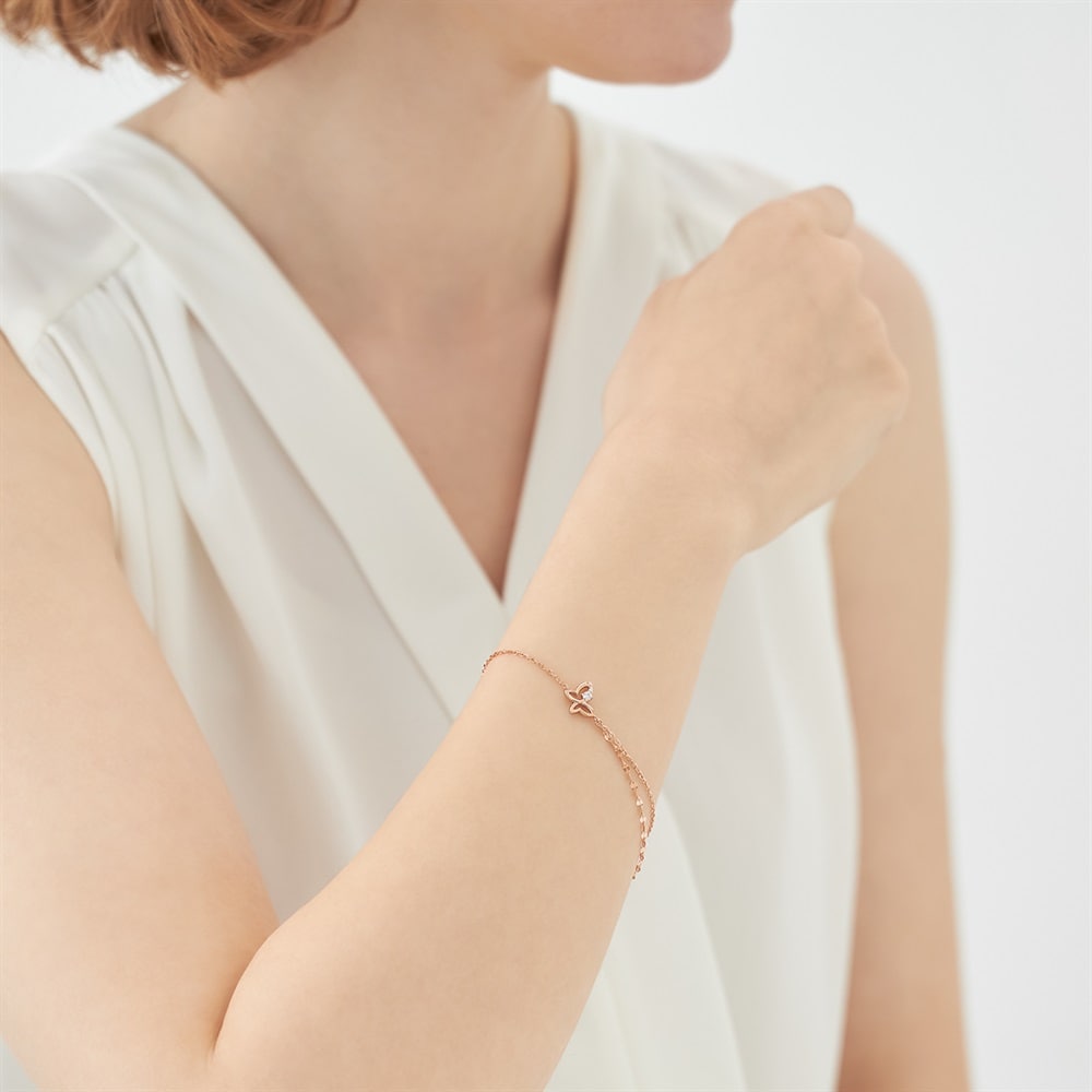 ピンクゴールドカラーが愛らしい蝶々モチーフのブレスレット。レイヤードのチェーンが揺れて手元に女性らしい華やかさをプラスするデザインです。バタフライは「美」「成長」「飛躍」を意味し、新しい自分への始まりや幸運を願うモチーフです。ご自身のご褒美やプレゼントにもおすすめのアイテムです。