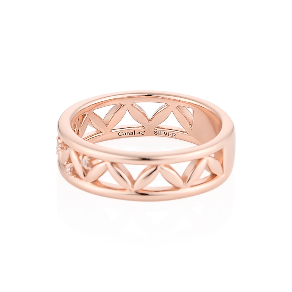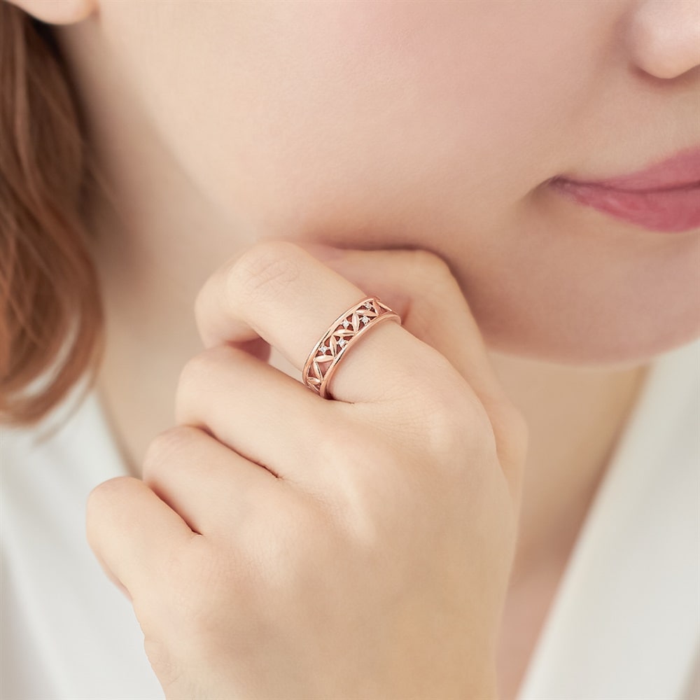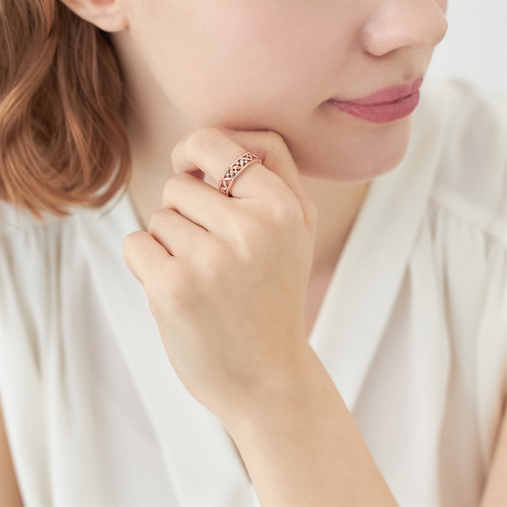 ストレートラインにボタニカルな透かし模様が印象的なデザインリング。軽やかな雰囲気を演出する、繊細な透かしのデザインがポイントです。ピンクゴールドカラーの色合いが女性らしい輝きを放ち、旬な手元を演出します。お手持ちのリングと重ね着けして、さまざまなスタイリングをお楽しみください。※ボリューム(幅)のあるリングは、通常より着用時にサイズが小さく感じる場合がございます。