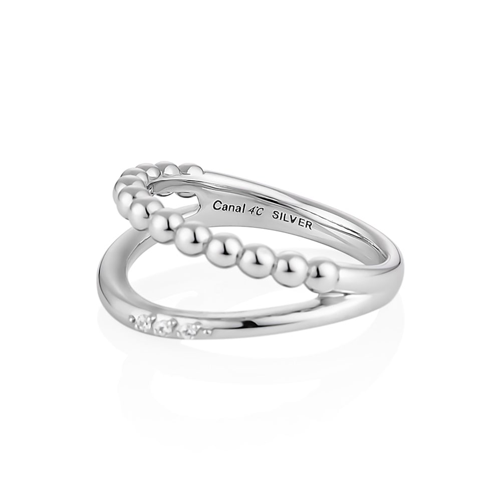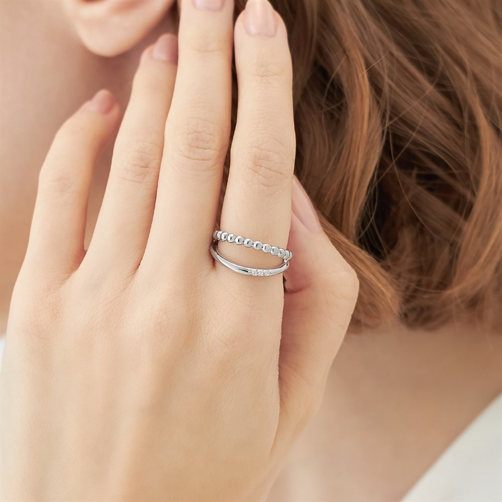 丸玉の地金とゆるやかなU字が連なる2連風リング。身に着けやすい程よいボリューム感で、1本でも華やかな存在感を放ちます。ロジウムカラーの上品なきらめきが魅力を一層引き立て、いつものコーディネートのアクセントに。お手持ちのリングと重ね着けして、さまざまなスタイリングをお楽しみください。※ボリューム(幅)のあるリングは、通常より着用時にサイズが小さく感じる場合がございます。