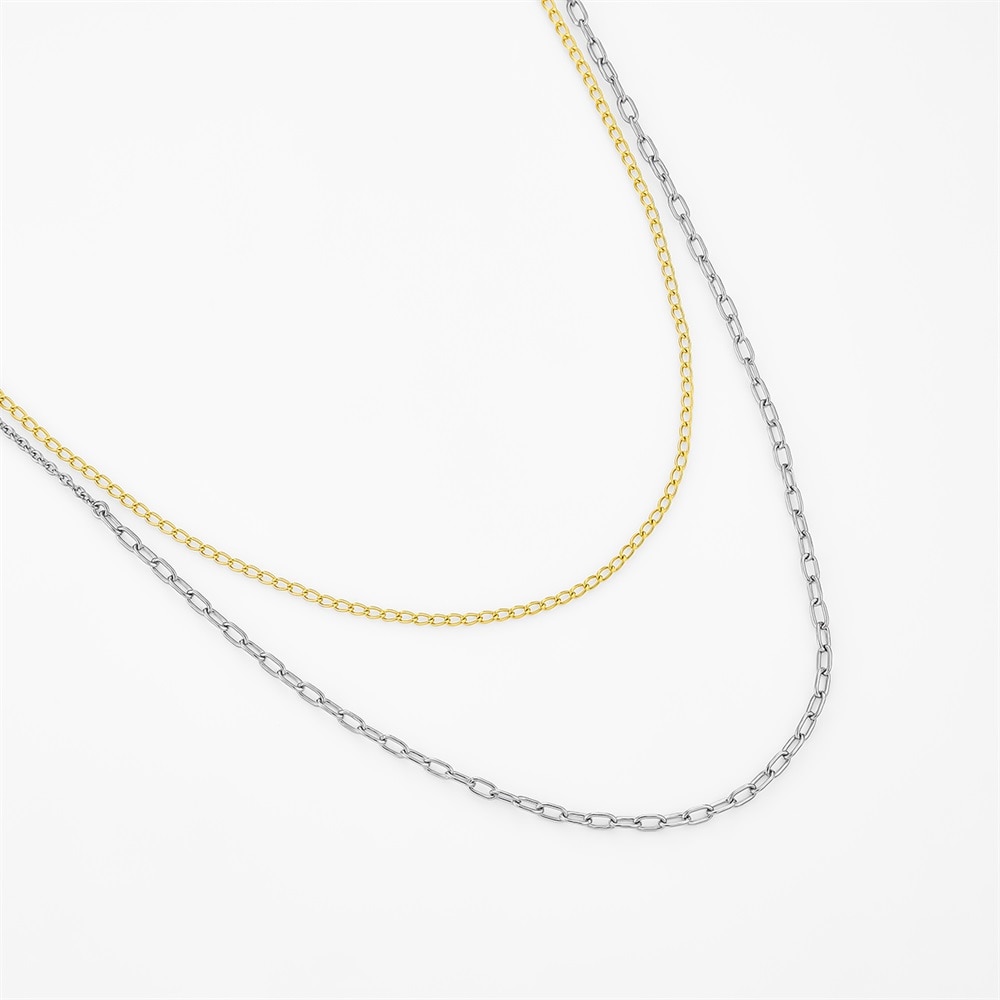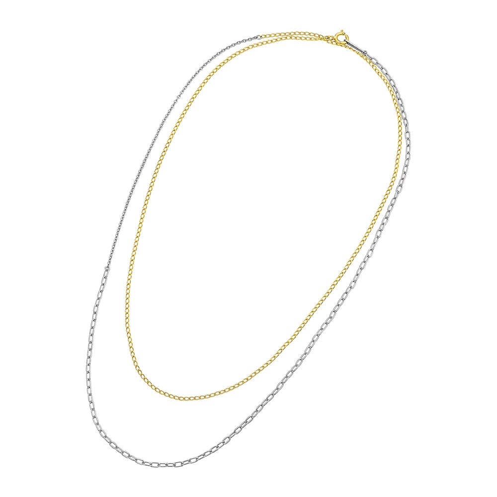 自然で自由にジュエリーの重ね着けを楽しんでいただける「Layered(レイヤード)」ジュエリーコレクション。コンビネーションカラーの80cmロングネックレス。シーンに合わせて、40cmの2連ネックレスにアレンジすることができます。3種類のチェーンを使用し、トレンド感のある雰囲気に。デイリーユースにおすすめのアイテムです。