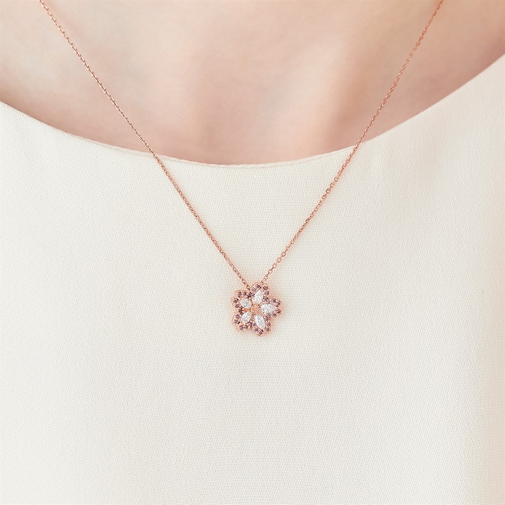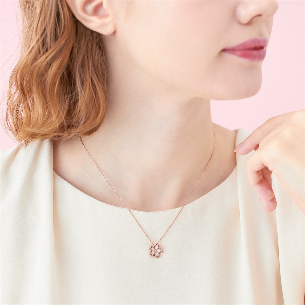 SAKURA Collection一覧はこちら >桜と空が重なり合う一瞬の情景に、春の想いを映した桜コレクション花びらの形にあしらわれたキュービックジルコニアが華やかなネックレス。クリアとピンクの石使いに、肌馴染みの良いピンクゴールドカラーを合わせ、上品でかわいらしい印象に。コーディネートのポイントになる存在感のあるネックレスです。【予約購入特典 なくなり次第終了】こちらのジュエリーをご購入のお客さまに、Canal4℃オリジナルジュエリートレーをプレゼント。※ショッピングバッグ内にノベルティの画像が表示されていない場合、ノベルティのお取り扱いは終了しております。※先行予約枠は数に限りがございます。ご希望のジュエリーがお品切れの場合は通常販売をお待ちください。通常販売開始:1月22日(木)16時00分からメッセージカードの作成は、通常販売時のみとなります。
