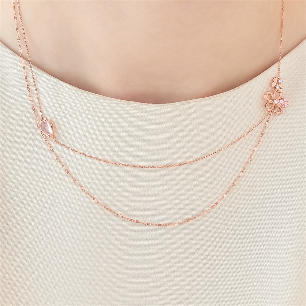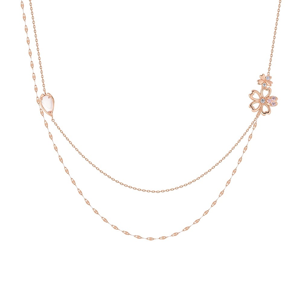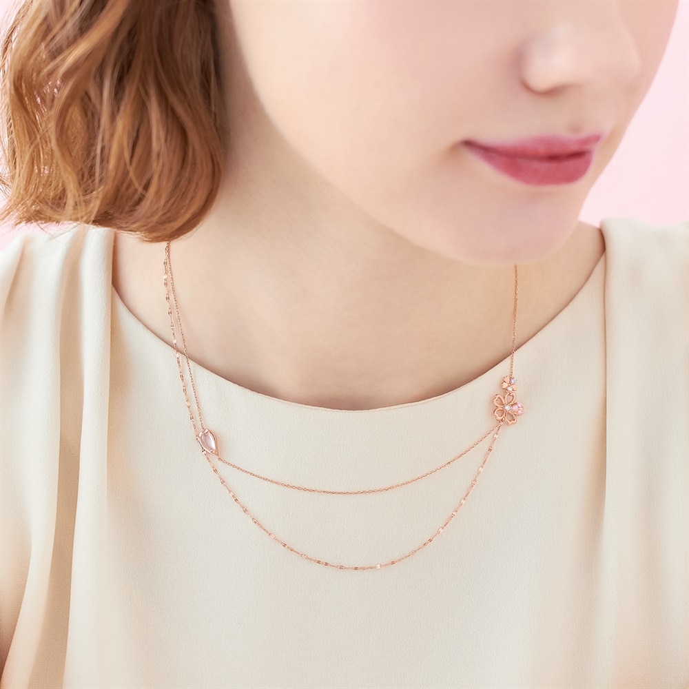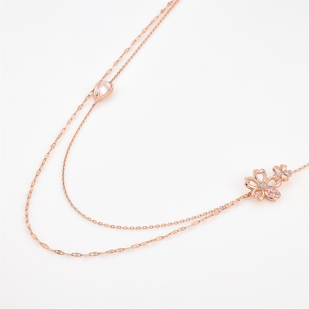 SAKURA Collection一覧はこちら >桜と空が重なり合う一瞬の情景に、春の想いを映した桜コレクションコーディネートの主役になる華やかな2連風ネックレス。桜にあしらわれたピンクやラベンダーカラーのストーンが夕暮れ空を想わせるデザイン。胸元で2本のチェーンがバランスよく並ぶよう、細部までこだわって仕上げました。存在感のあるデザインは、特別な方へのギフトにもおすすめです。※天然石・天然素材を使用しているため、実際の色味や風合いが異なる場合がございます。【予約購入特典 なくなり次第終了】こちらのジュエリーをご購入のお客さまに、Canal4℃オリジナルジュエリートレーをプレゼント。※ショッピングバッグ内にノベルティの画像が表示されていない場合、ノベルティのお取り扱いは終了しております。※先行予約枠は数に限りがございます。ご希望のジュエリーがお品切れの場合は通常販売をお待ちください。通常販売開始:1月22日(木)16時00分からメッセージカードの作成は、通常販売時のみとなります。
