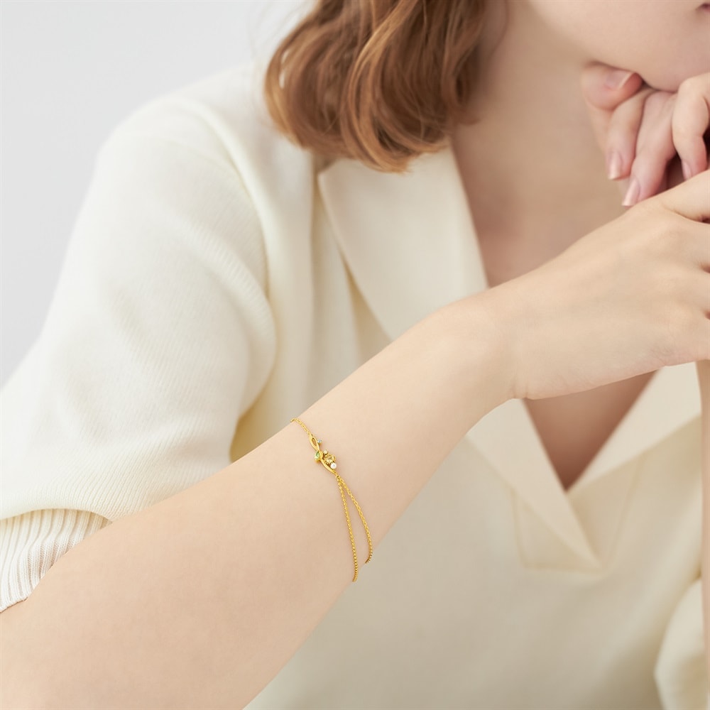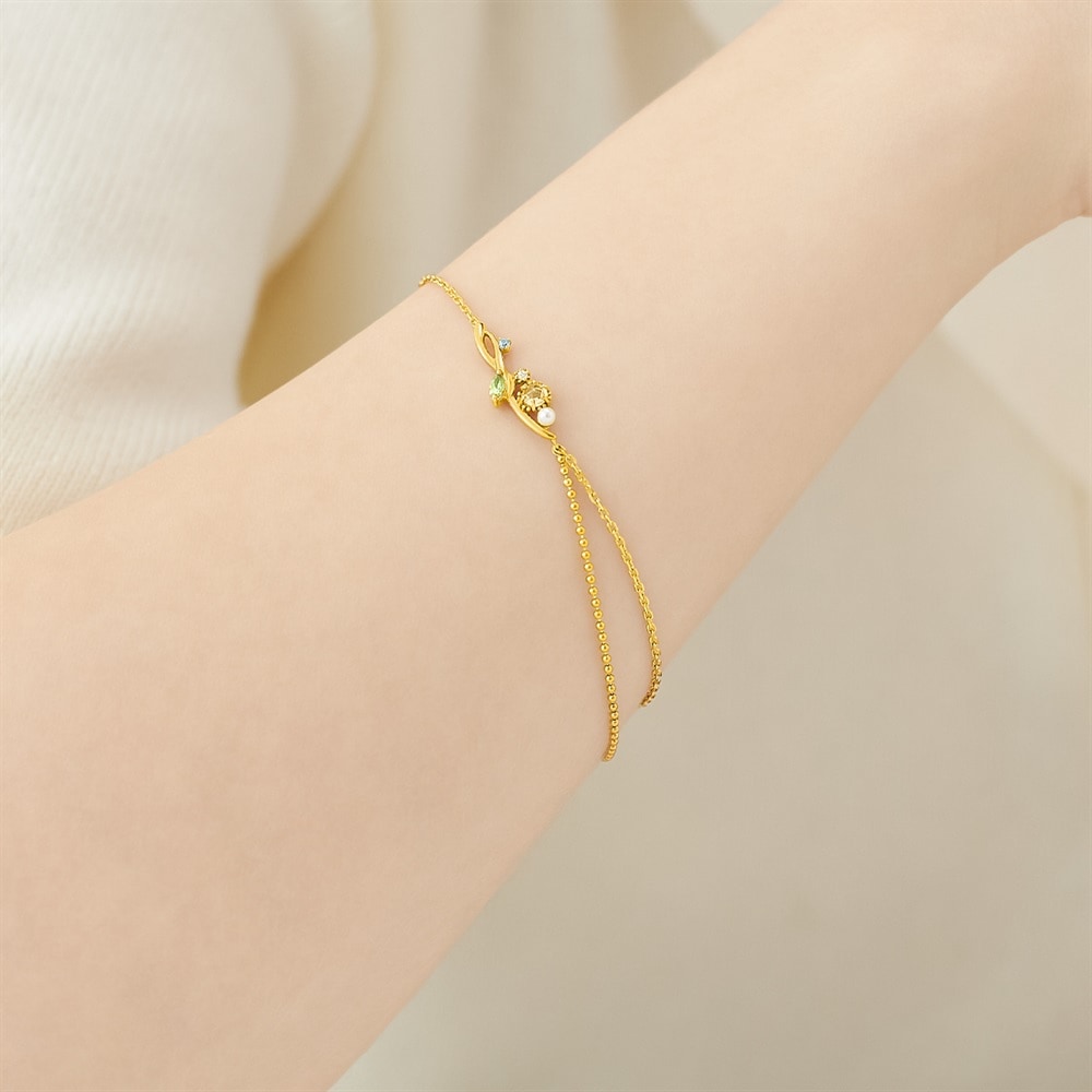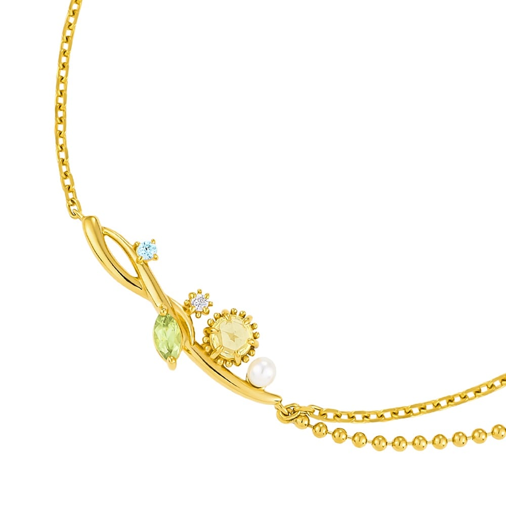 MIMOSA Collection一覧はこちら > 澄んだ空とやさしい黄色のミモザが描く春の情景を表現したジュエリーコレクション。ボタニカルな雰囲気の地金のラインにミモザが優しく寄り添うブレスレット。ミモザの小さな花のようなボールチェーンのレイヤーが腕周りを華やかに演出。鮮やかなグリーンカラーのペリドットと爽やかなブルーカラーのキュービックジルコニアがアクセントとして輝きます。大切な方へのギフトにもおすすめです。3月8日の国際女性デーは男性から女性に向けてミモザの花が贈られるようになったことから「ミモザの日」とも言われています。※天然石・天然素材を使用しているため、実際の色味や風合いが異なる場合がございます。【購入特典 なくなり次第終了】こちらのジュエリーをご購入のお客さまに、オリジナルミモザ刺繍ハンカチをプレゼント。※ホワイト、イエローの2色から選べます。※ショッピングバッグ内にノベルティの画像が表示されていない場合、ノベルティのお取り扱いは終了しております。