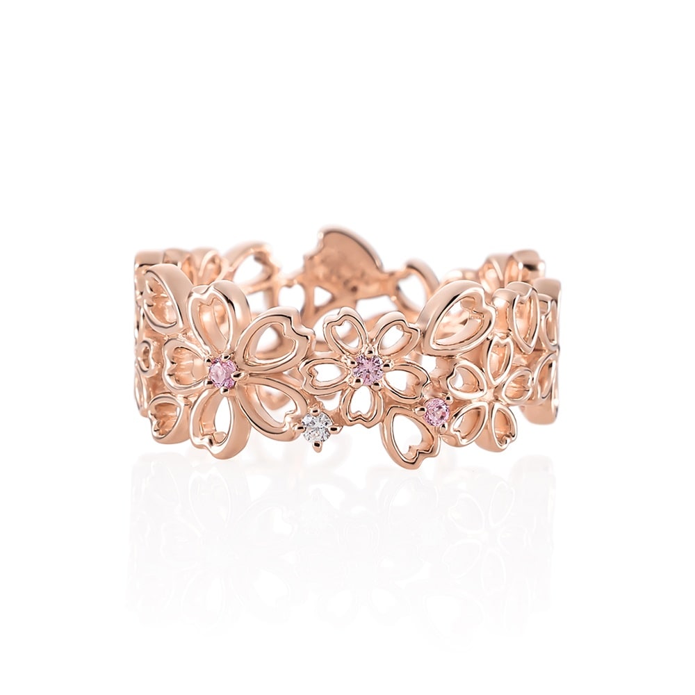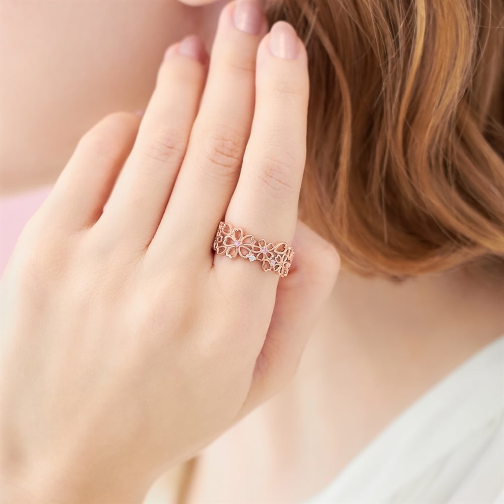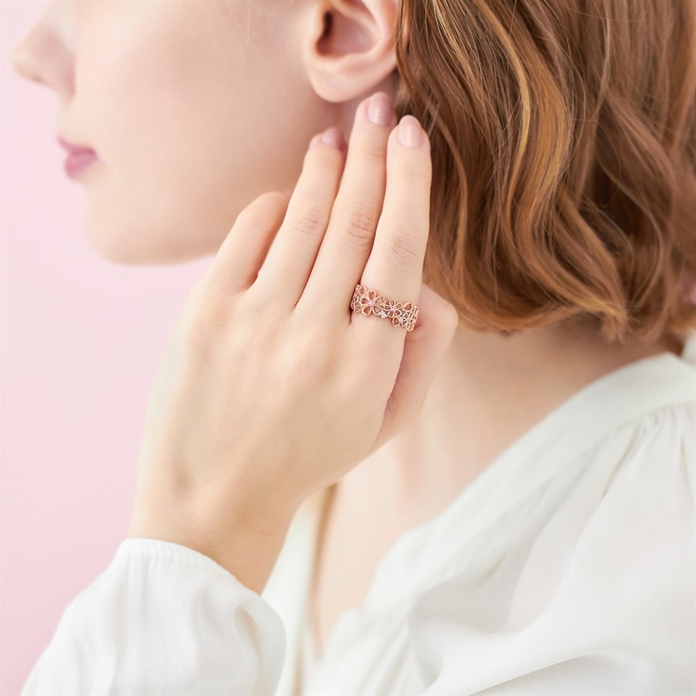SAKURA Collection一覧はこちら >桜と空が重なり合う一瞬の情景に、春の想いを映した桜コレクション花びらが風に舞うように重なり合う軽やかな透かし模様のリング。ピンクのグラデーションカラーのキュービックジルコニアが優しくきらめきます。指を1周包み込むように桜模様が入った存在感のあるリングです。※ボリューム(幅)のあるリングは、通常より着用時にサイズが小さく感じる場合がございます。【予約購入特典 なくなり次第終了】こちらのジュエリーをご購入のお客さまに、Canal4℃オリジナルジュエリートレーをプレゼント。※ショッピングバッグ内にノベルティの画像が表示されていない場合、ノベルティのお取り扱いは終了しております。※先行予約枠は数に限りがございます。ご希望のジュエリーがお品切れの場合は通常販売をお待ちください。通常販売開始:1月22日(木)16時00分からメッセージカードの作成は、通常販売時のみとなります。
