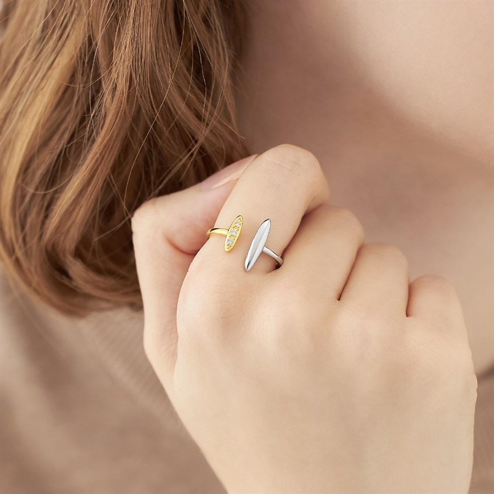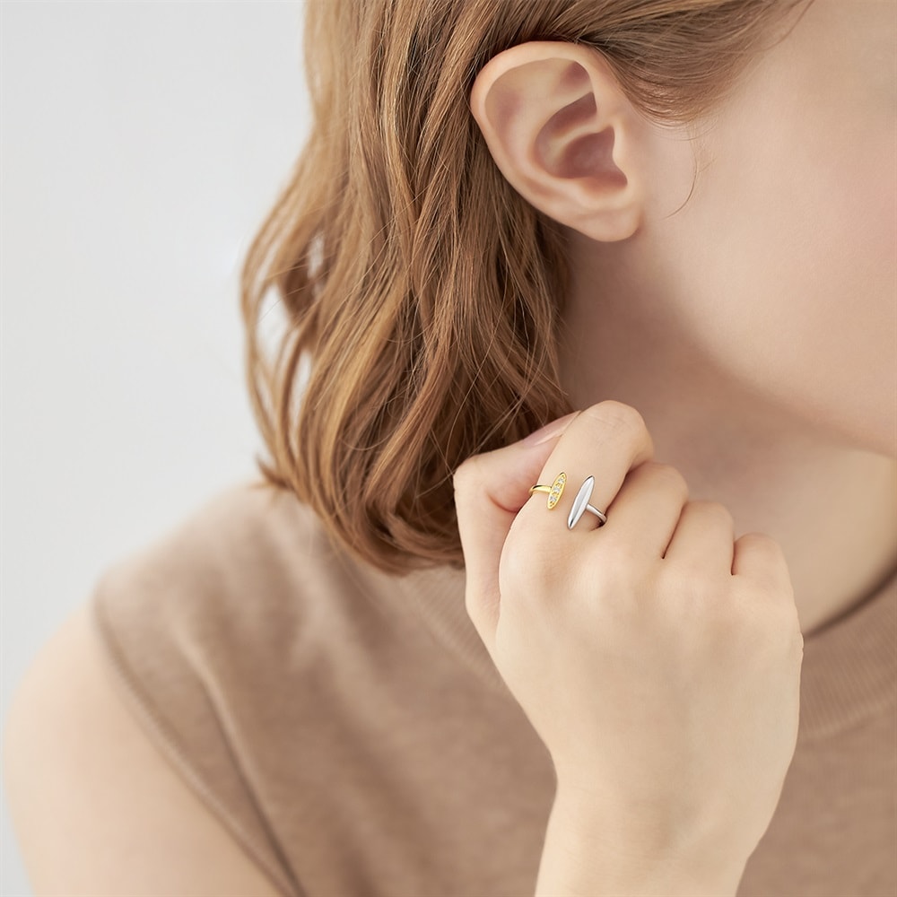 自然で自由にジュエリーの重ね着けを楽しんでいただける「Layered(レイヤード)」ジュエリーコレクション。コンビネーションカラーのオープンリング。アシンメトリーでモダンなデザインはトレンド感を演出します。1本で手元のアクセントになるアイテムです。※ボリューム(幅)のあるリングは、通常より着用時にサイズが小さく感じる場合がございます。