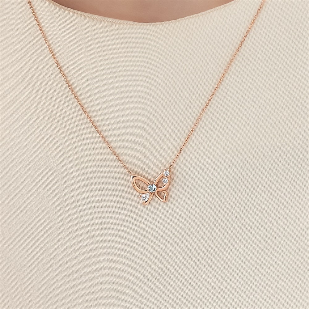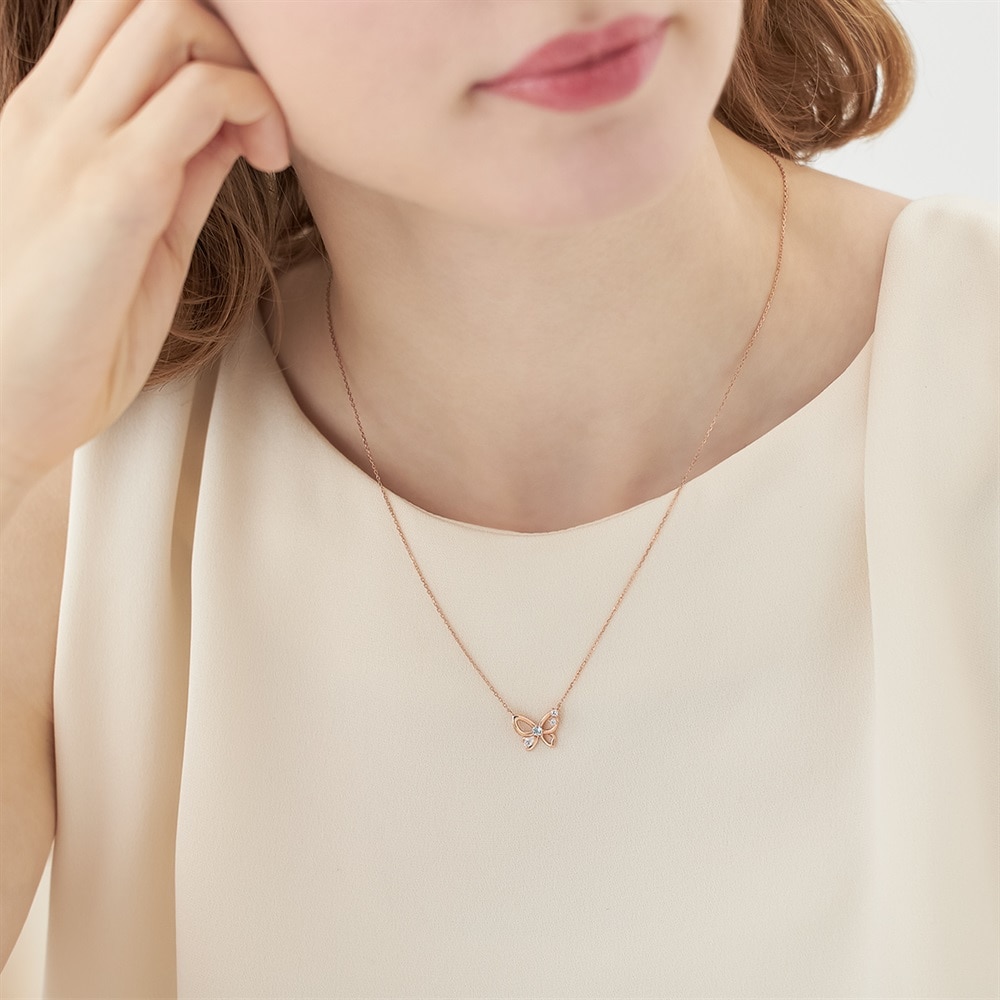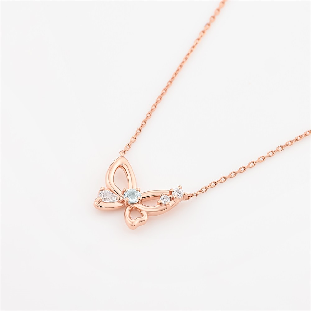 幸運の意味を持つ、3月の誕生石アクアマリンがポイントのバースデージュエリー。羽ばたくシーズンに向けた「飛躍」の意味を持つ蝶モチーフのネックレスです。やわらかなラインが描く抜け感でデコルテラインを美しく見せ、軽やかに身に着けていただけます。バースデーギフトやご自身用のパーソナルジュエリーとしておすすめです。※天然石・天然素材を使用しているため、実際の色味や風合いが異なる場合がございます。