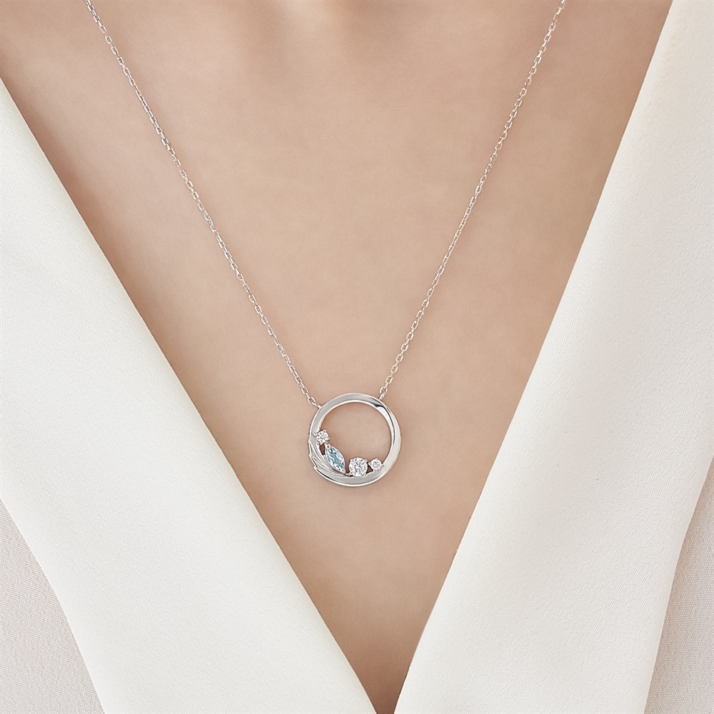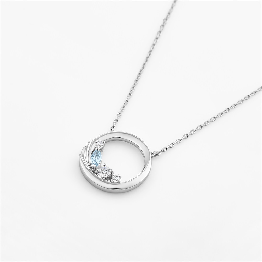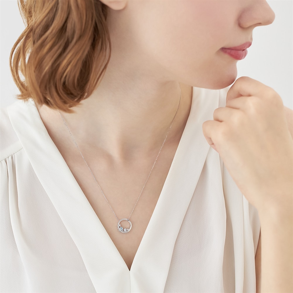 幸運の意味を持つ、3月の誕生石アクアマリンがポイントのバースデージュエリー。羽ばたくシーズンに向けて、サークルの中に「飛躍」の意味を持つフェザーを取り入れたネックレスです。シルバーカラーにやわらかなブルーのアクアマリンが留められ、みずみずしくきらめきます。バースデーギフトやご自身用のパーソナルジュエリーとしておすすめです。※天然石・天然素材を使用しているため、実際の色味や風合いが異なる場合がございます。