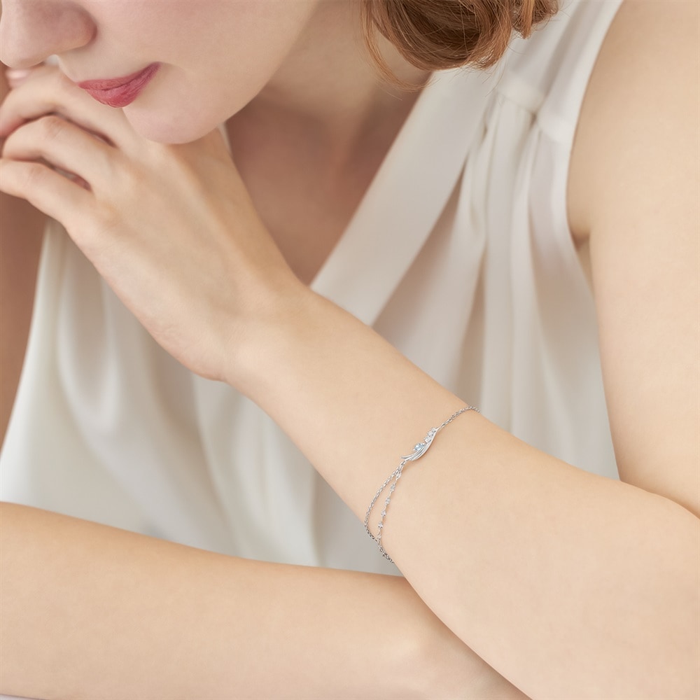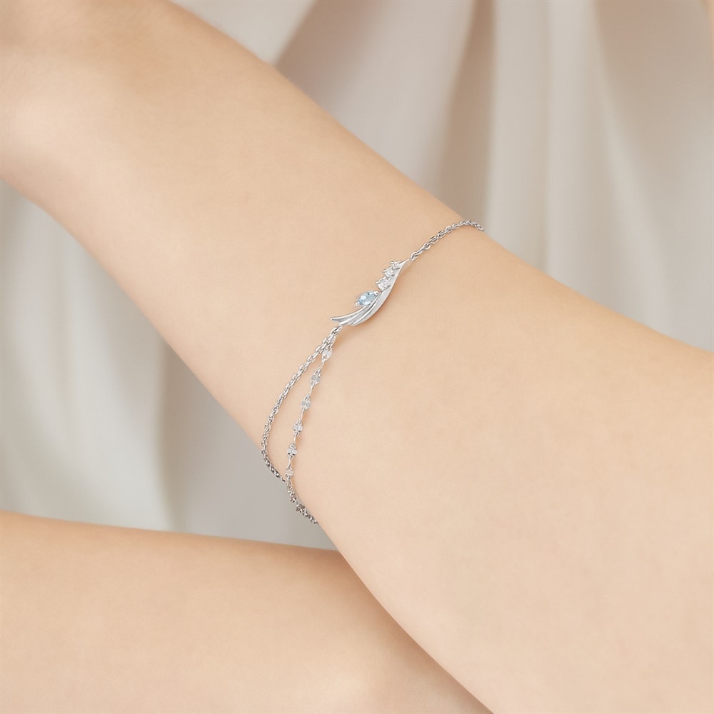 幸運の意味を持つ、3月の誕生石アクアマリンがポイントのバースデージュエリー。羽ばたくシーズンに向けた「飛躍」の意味を持つフェザーモチーフのブレスレット。シルバーカラーにやわらかなブルーのアクアマリンが留められ、みずみずしくきらめきます。揺れるデザインチェーンもお手元を華やかに演出。ご自身へのプレゼントはもちろん、バースデーギフトにもおすすめです。※天然石・天然素材を使用しているため、実際の色味や風合いが異なる場合がございます。