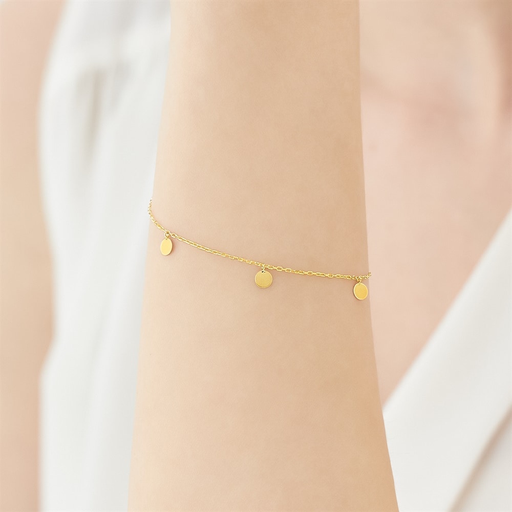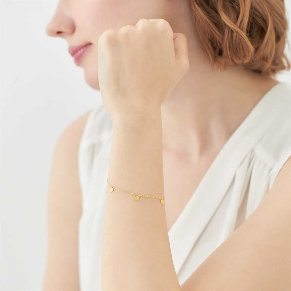 手元を華やかに揺れるサークルプレートがポイントのK10ブレスレット。動くたびに上品にきらめき、ひとつでも存在感のある華やかなデザインが魅力です。ご自身用はもちろん大切な方へのギフトとしてもおすすめです。