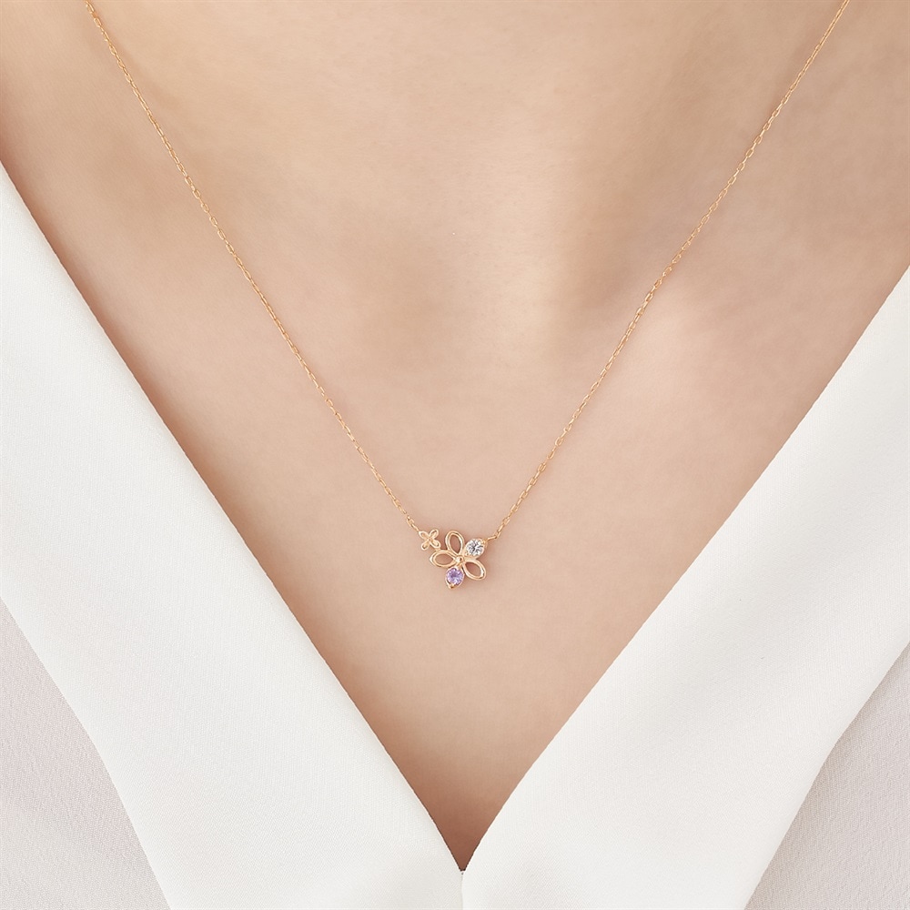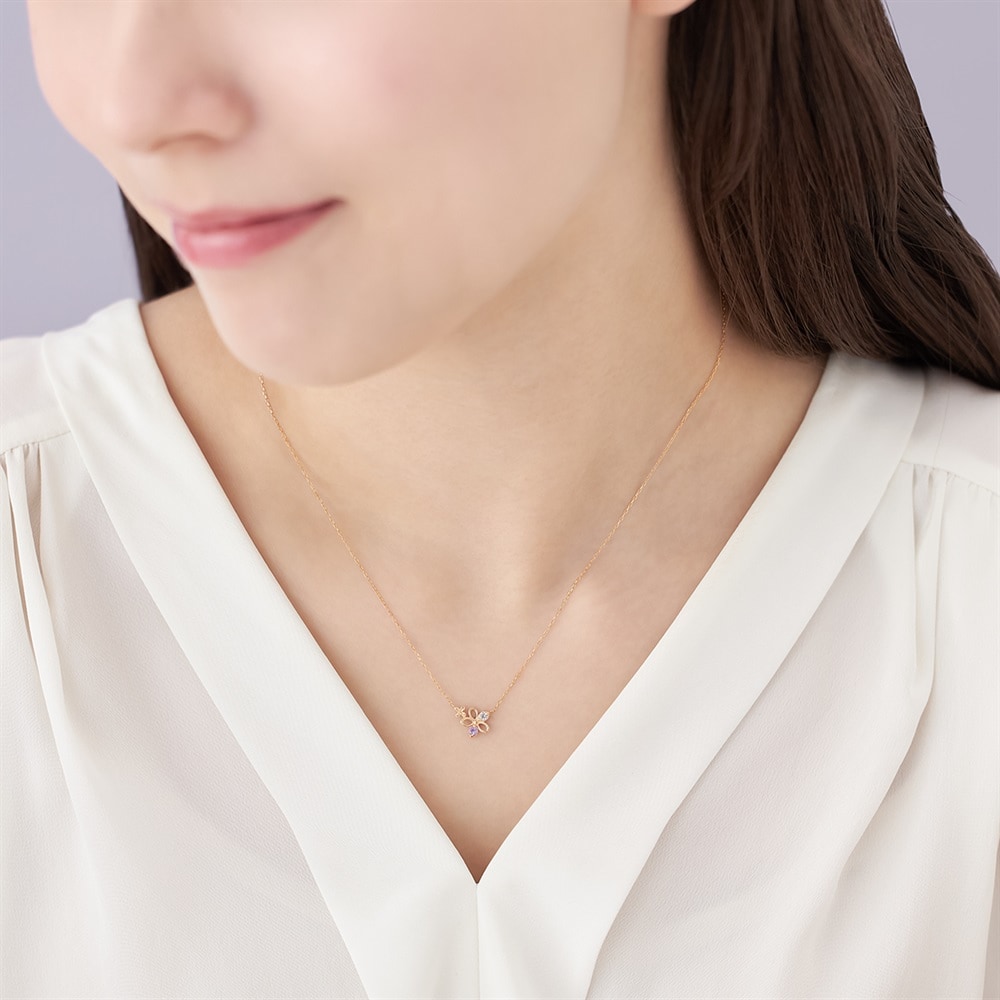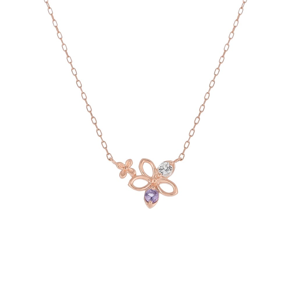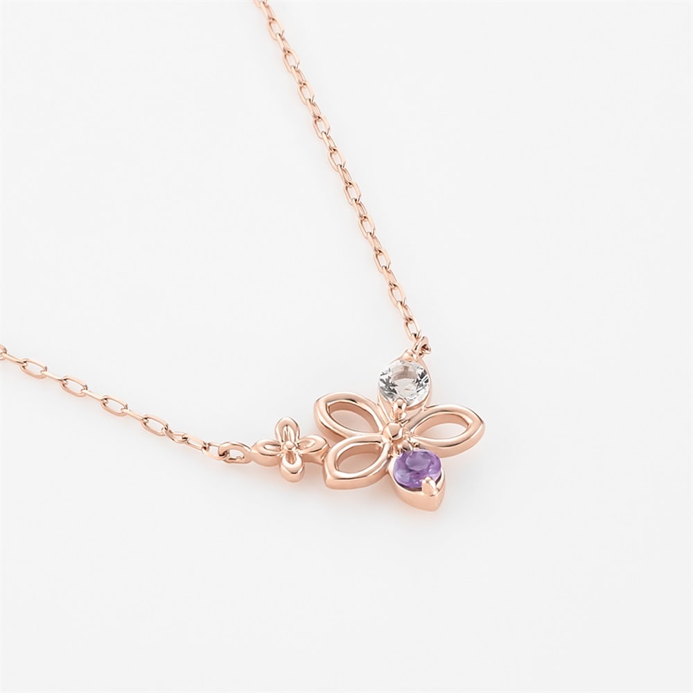 ふわりと香る春の便りが、新しい季節へ導いてくれる Spring Collection -Floral notes-春の訪れを告げるライラックをモチーフにしたシリーズ。鮮やかなアメシストがアクセントのK10ネックレス。ごく稀に咲く5枚の花びらの「ハッピーライラック」を軽やかな透かしの表現でデザインし、お守り代わりとしても身に着けられるアイテムです。日常使いしやすいサイズ感で、ご自身へのご褒美や、大切な方へのギフトにもおすすめです。※天然石・天然素材を使用しているため、実際の色味や風合いが異なる場合がございます。【数量限定ケース付き】 なくなり次第終了※ショッピングバッグ内の画像が限定ケースではない場合、限定ケースのお取り扱いは終了しております。