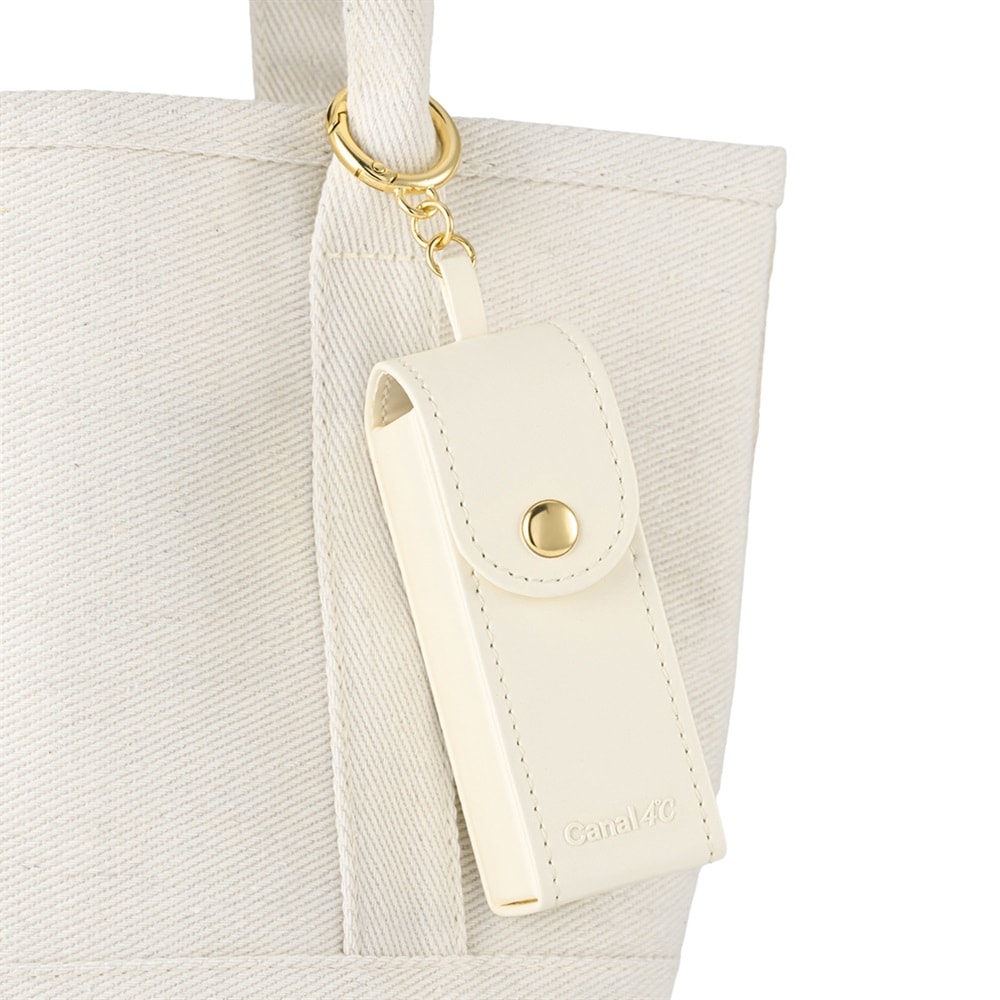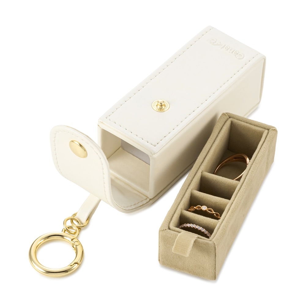 出先でもリングを気軽に着け外しできるリングポーチ。繊細なラメをまとった「パウダーホワイト」。バッグなどに取り付けられるため持ち運びしやすく、コーディネートのアクセントとしても活躍。大きめの収納部分にはボリュームのあるリングや、他のアイテムも収納可能です。中の仕切りを外せば、リップケースとしてもご使用いただけます。友人へのプチギフトにはもちろん、ジュエリーとセットで贈る特別なギフトとしてもおすすめです。※バッグの持ち手に通らない場合は、取り付け可能な部分にご使用ください。
