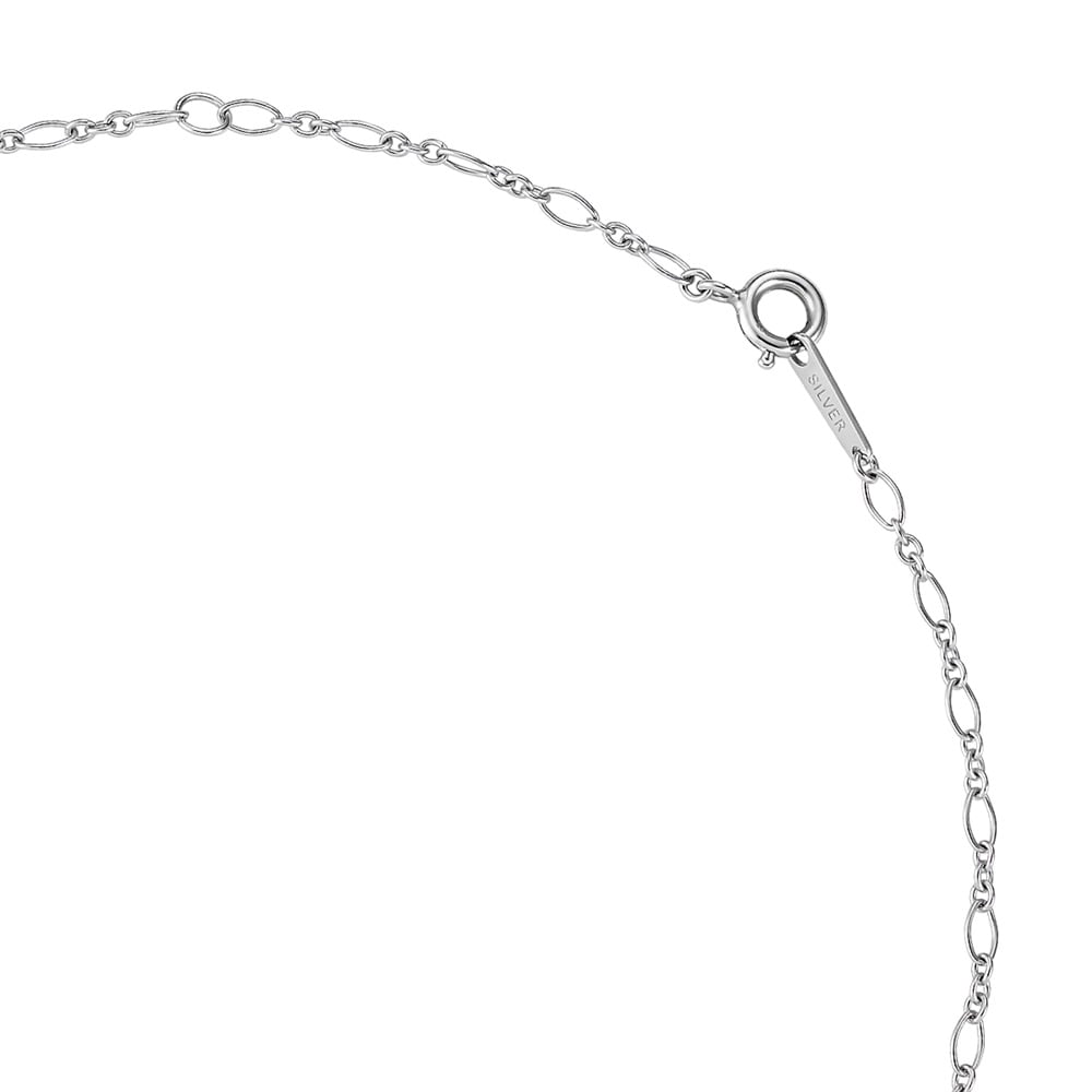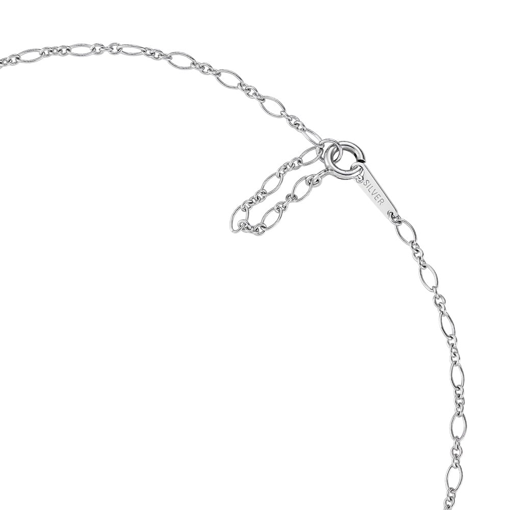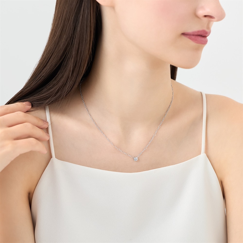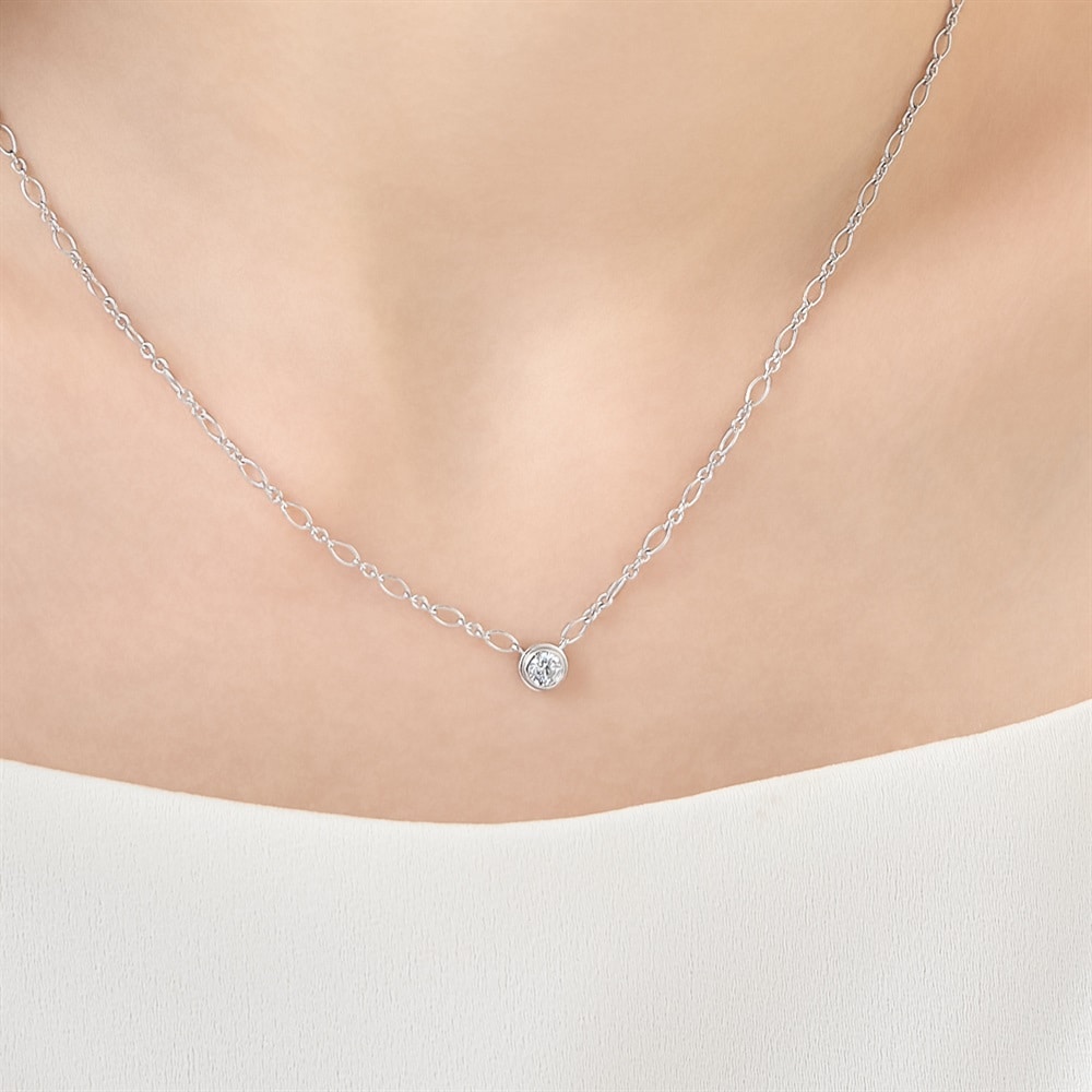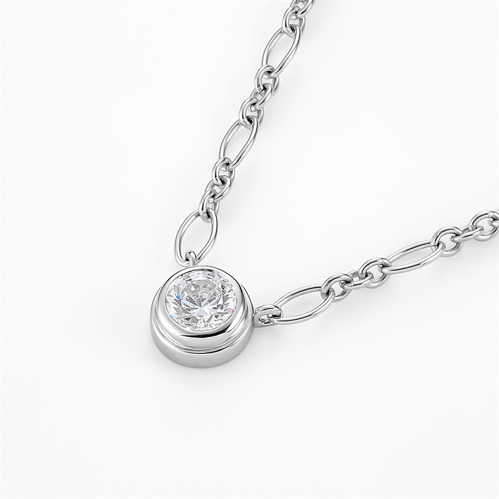 首元に存在感を与える華やかなデザインチェーンを使用した、ロジウムコーティングのミニマルなネックレス。ラウンドの縁付きの伏せ込みで仕立て、キュービックジルコニアのシルエットをやわらかく引き立てます。ラウンドは「調和」「繋がり」「永遠」を象徴します。身に着けると顔周りをさり気なく明るくして単品でも重ね着けでもなじみます。