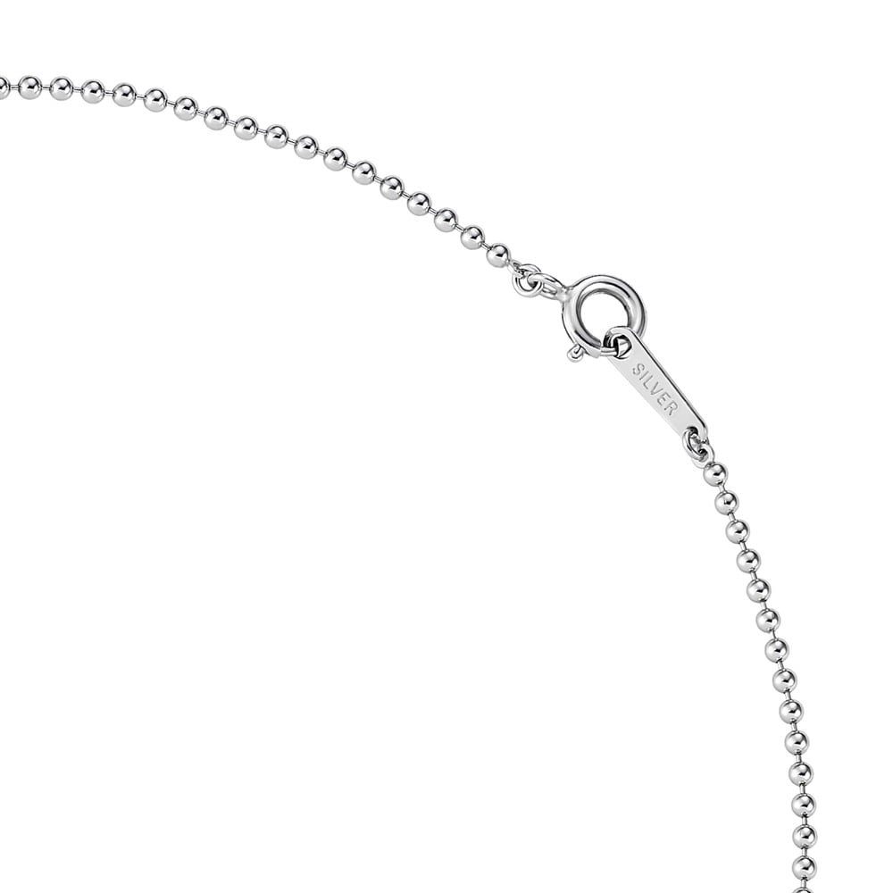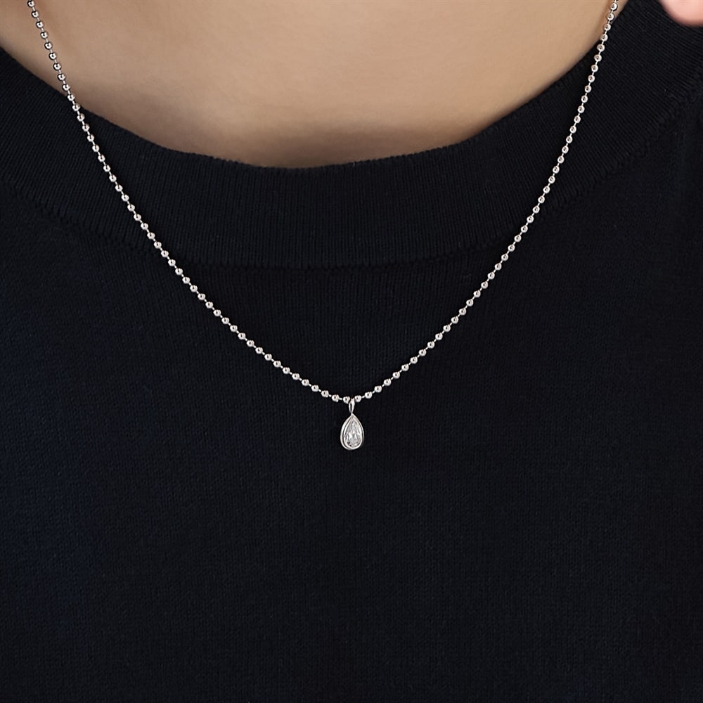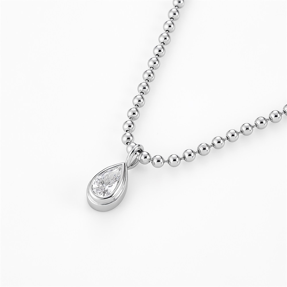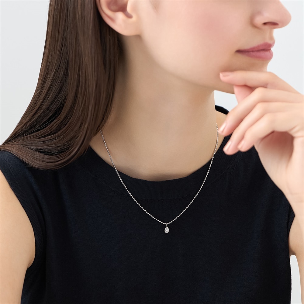 キュービックジルコニアのペアシェイプを縁付きの伏せ込みで仕立てた、ロジウムコーティングのミニマルなネックレス。ボールチェーンの存在感とペアシェイプのすっきりとしたシルエットが程よいバランスのデザインです。縁がしずくのフォルムを際立たせやわらかな光のまとまりで上品なきらめきを生み出します。しずくは「浄化」「清らかさ」「瑞々しさ」を象徴し、身に着けると顔周りをすっきり明るく見せます。