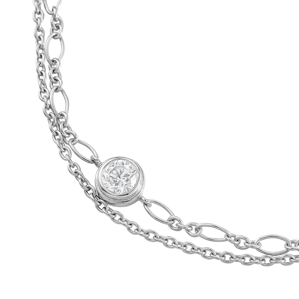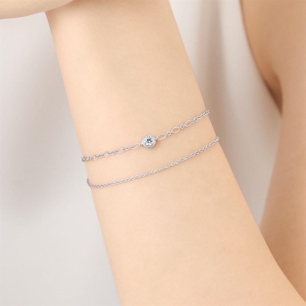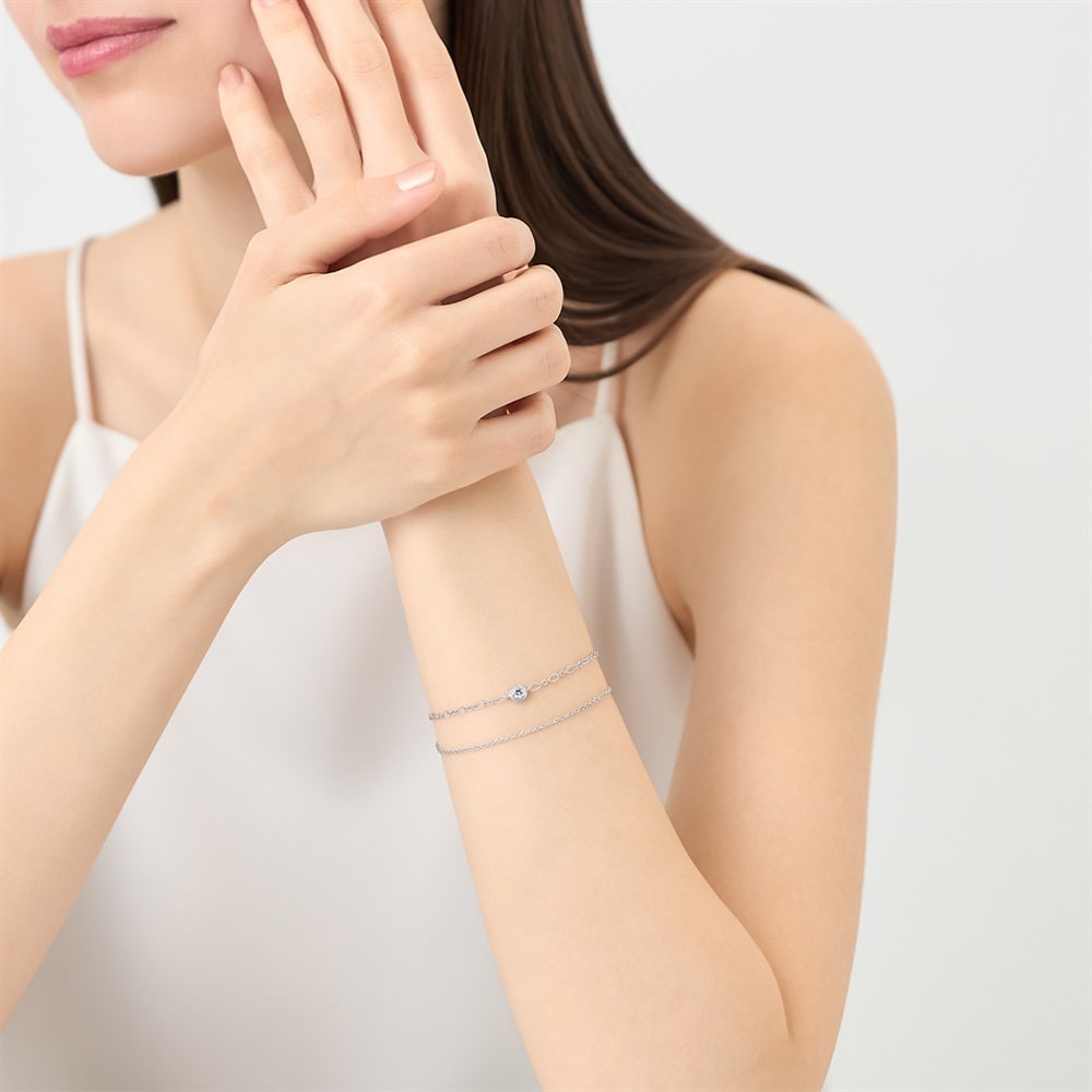 ラウンドカットのキュービックジルコニアを中心に据え、異なるデザインチェーンを組み合わせたロジウムコーティングの2連ブレスレット。縁付きの伏せ込みが石のシルエットを引き立て、チェーンの表情の違いが手元に繊細な奥行きを生むデザイン。ラウンドは「調和」「繋がり」「永遠」を象徴し、身に着けると手元にさり気ない華やかさを添えます。