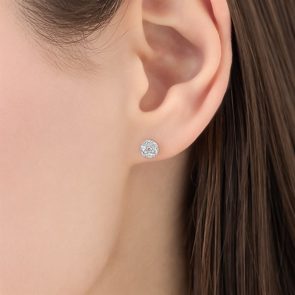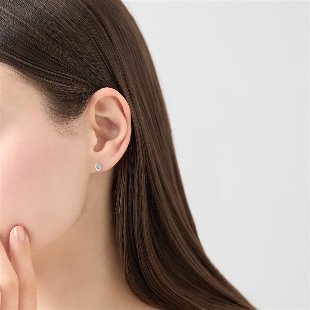 キュービックジルコニアを敷き詰めたパヴェデザインのスタッドピアス。繊細な石ぞろえが光を反射して、耳元に上品なきらめきをもたらします。ロジウムコーティングのサークルのパヴェが耳たぶにやわらかく溶け込み、さり気ない華やかさを添えます。身に着けると顔周りが明るくなり、デイリーからフォーマルまでなじむ汎用性の高い一粒です。