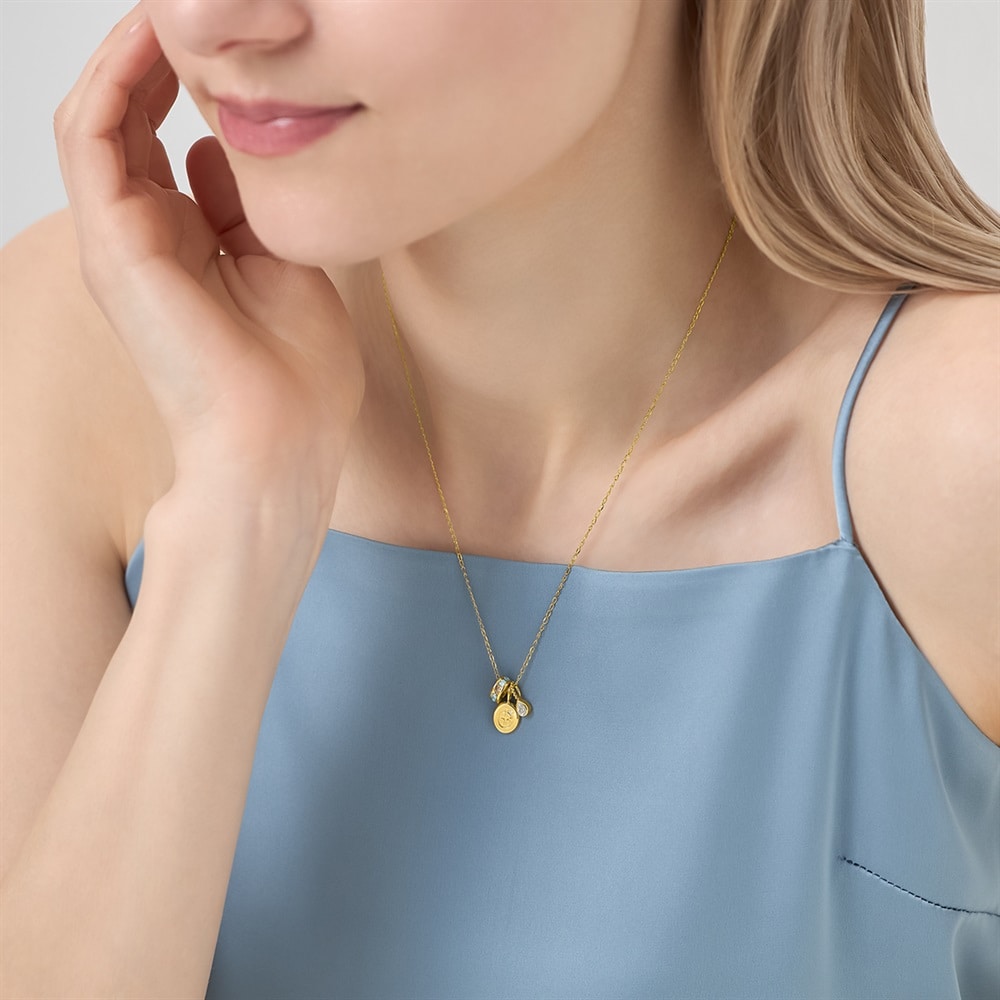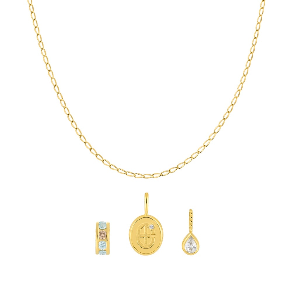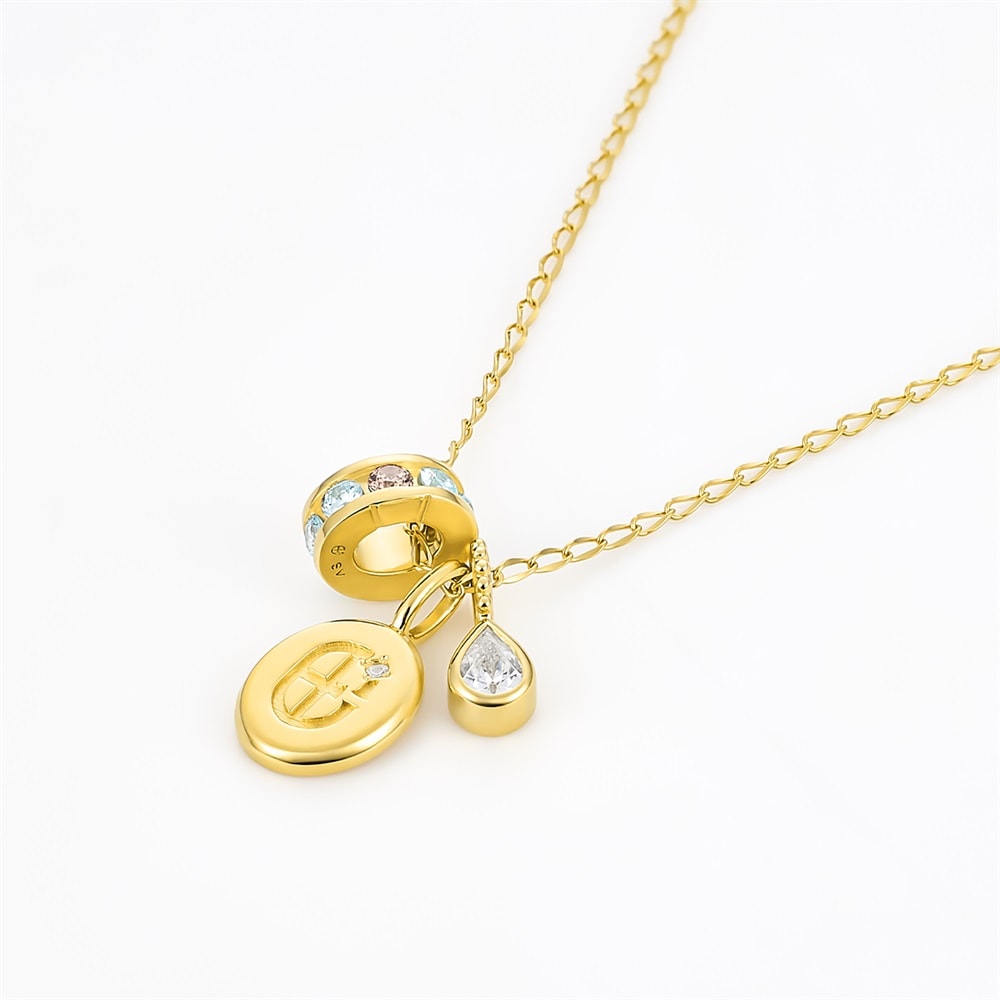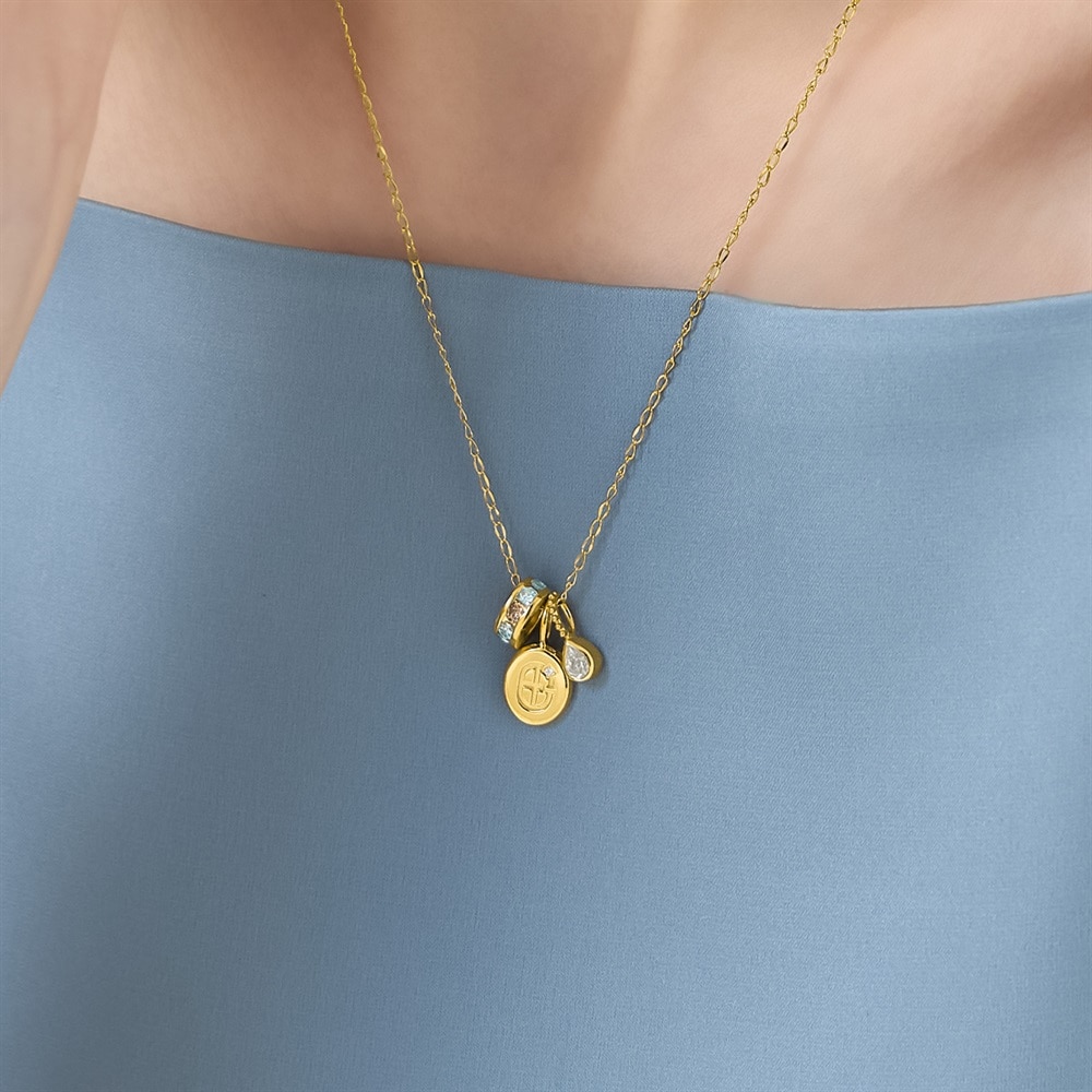 CANAL 4℃のシンボルマークを日常に寄り添うジュエリーとして表現したコレクション。3つのチャームがリズミカルに揺れるイエローゴールドカラーのネックレス。モダンな印象のコインチャーム、みずみずしくきらめくしずくのチャーム、ブランドを象徴するブルーとブラウンのキュービックジルコニアをあしらったチャームを組み合わせました。3つのチャームがつくる程よいリズムと余白が、主張しすぎず奥行きを生み、どんなスタイリングにも自然に溶け込みます。【同コレクションのアイテムはこちら】