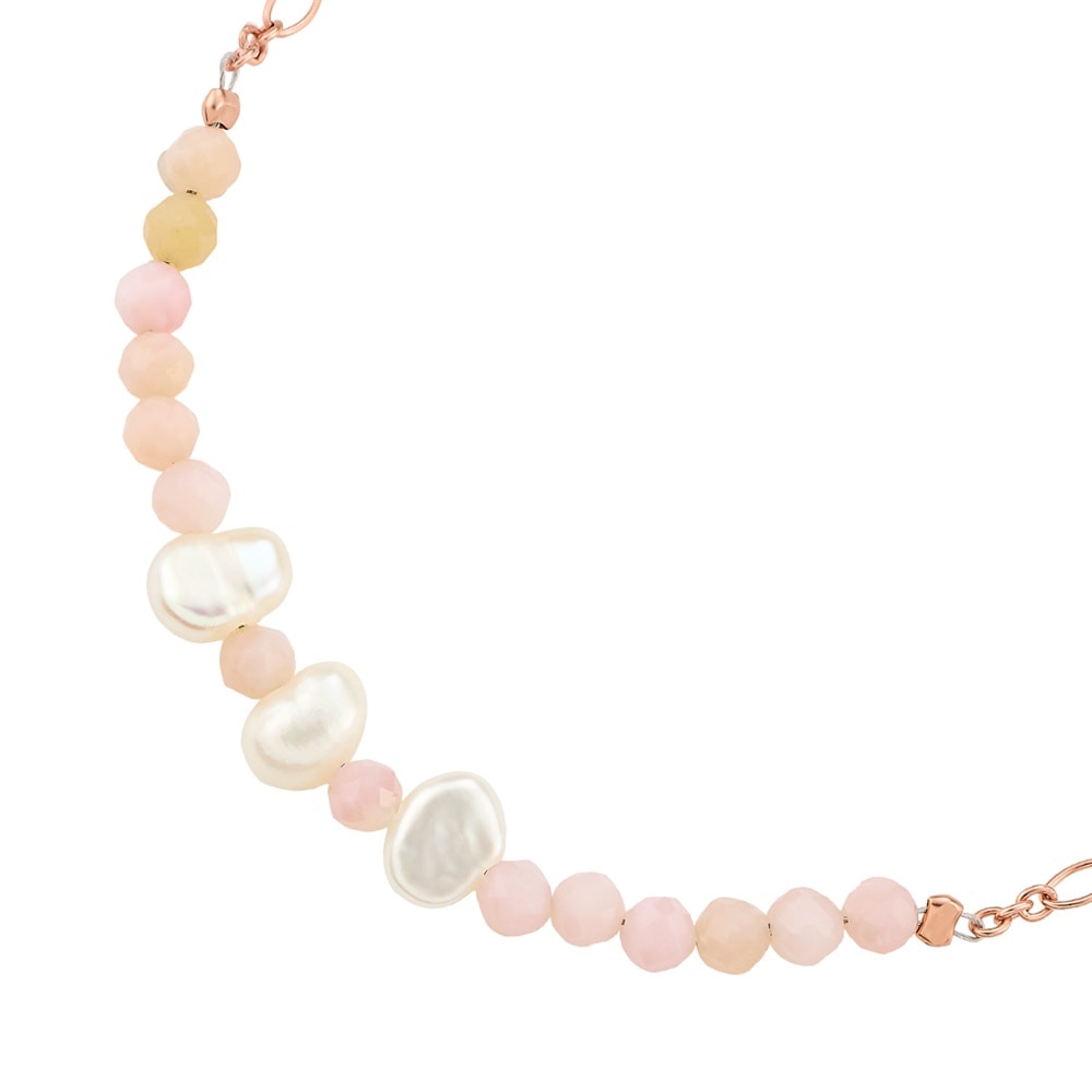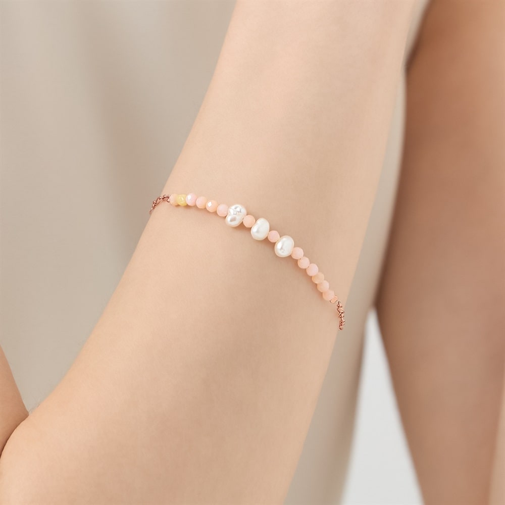 ビーズを使用したピンクカラーのブレスレット。涼しげな石使いが夏らしく、いつものコーディネートにプラスワンアイテムとしておすすめです。やわらかな色合いが手元のアクセントとなるデザインで、お手持ちのブレスレットとの重ね着けにもおすすめです。※天然石を使用しているため、実際の色味や風合いが異なる場合がございます。