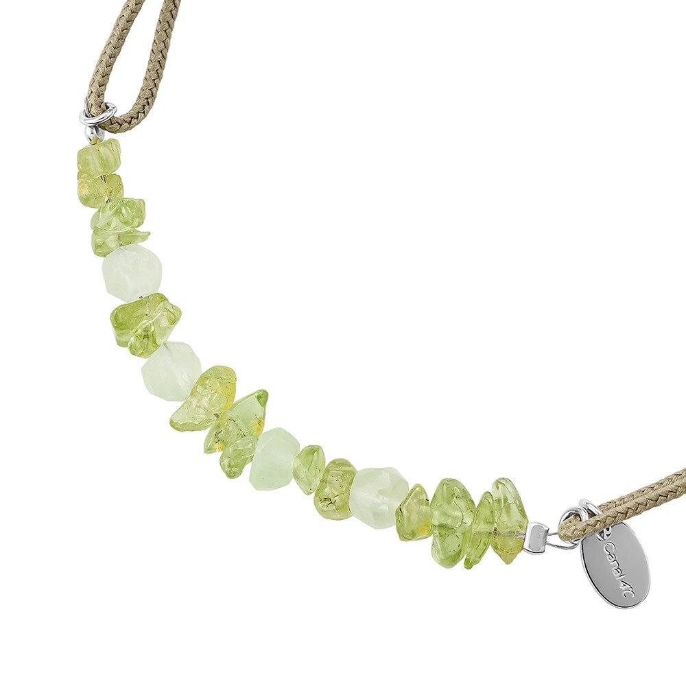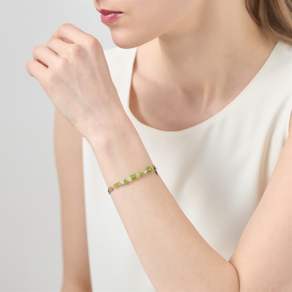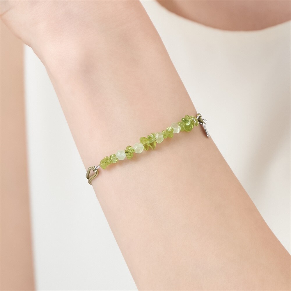 ビーズを使用したグリーンカラーのコードブレスレット。さまざまなサイズの石が並び、手元を彩ります。涼しげな石使いが夏らしく、いつものコーディネートにプラスワンアイテムとしておすすめです。ご自身のお好きな長さでお使いいただけるため、身に着けやすいアイテムです。※天然石を使用しているため、実際の色味や風合いが異なる場合がございます。