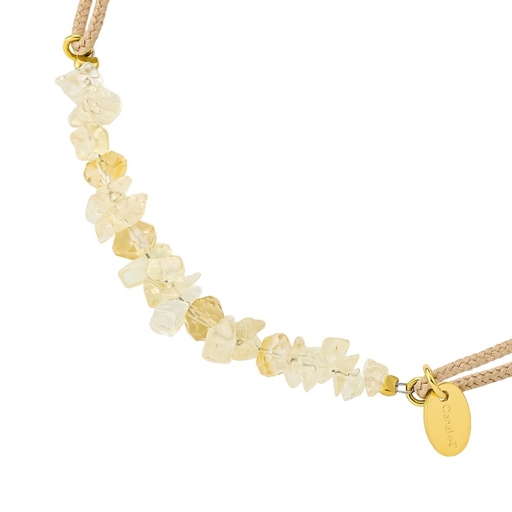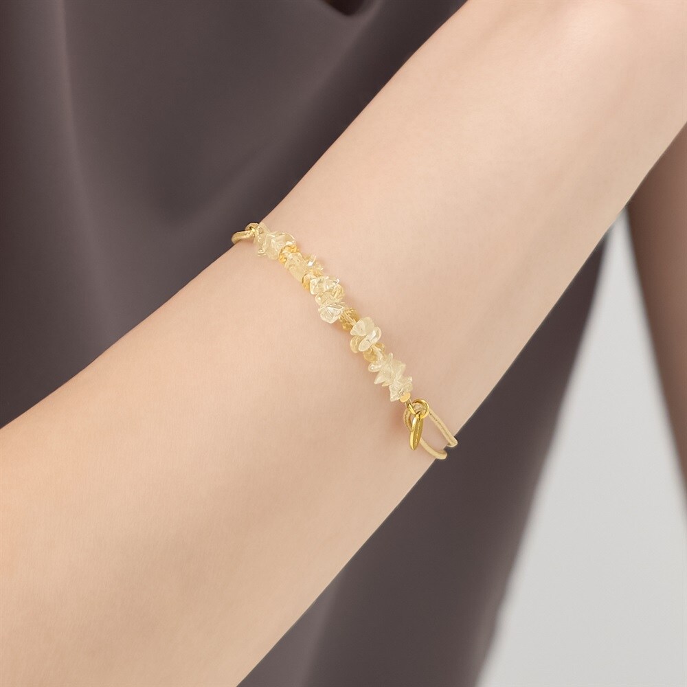 ビーズを使用したイエローカラーのコードブレスレット。さまざまなサイズの石が並び、手元を彩ります。涼しげな石使いが夏らしく、いつものコーディネートにプラスワンアイテムとしておすすめです。ご自身のお好きな長さでお使いいただけるため、身に着けやすいアイテムです。※天然石を使用しているため、実際の色味や風合いが異なる場合がございます。
