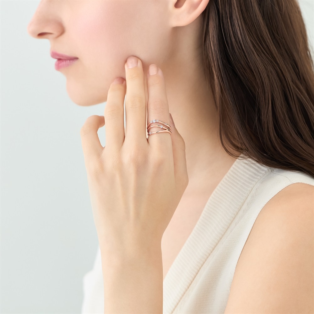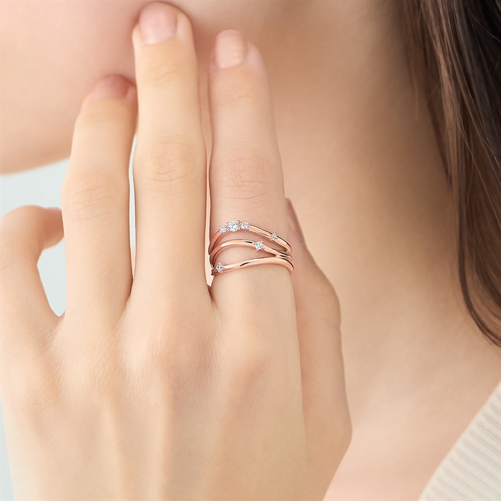 「初夏のやわらかな光と風」をイメージした、日常にさり気ない華やぎをもたらすアーリーサマーコレクション。波打つようなやわらかな3本のラインが重なり合う、全周デザインのリング。ボリューム感がしっかりとあり、1本で手元のコーディネートが完成します。存在感があるため、シンプルなコーデのアクセントになります。※ボリューム(幅)のあるリングは、通常より着用時にサイズが小さく感じる場合がございます。※強い力が加わると変形する可能性がありますので、お取り扱いにはご注意ください。 【数量限定ケース付き】 なくなり次第終了※ショッピングバッグ内の画像が限定ケースではない場合、限定ケースのお取り扱いは終了しております。