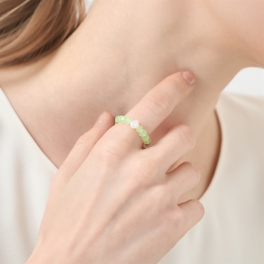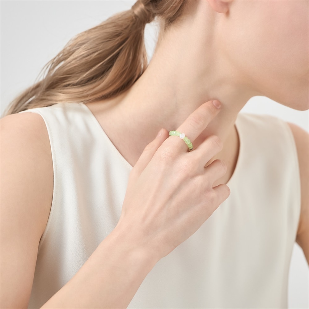 ビーズを使用したグリーンカラーのリング。涼しげな石使いが夏らしく、いつものコーディネートにプラスワンアイテムとしておすすめです。お手持ちのリングやブレスレットとの重ね着けもしやすく、ご自身へのご褒美にもおすすめです。※天然石を使用しているため、実際の色味や風合いが異なる場合がございます。