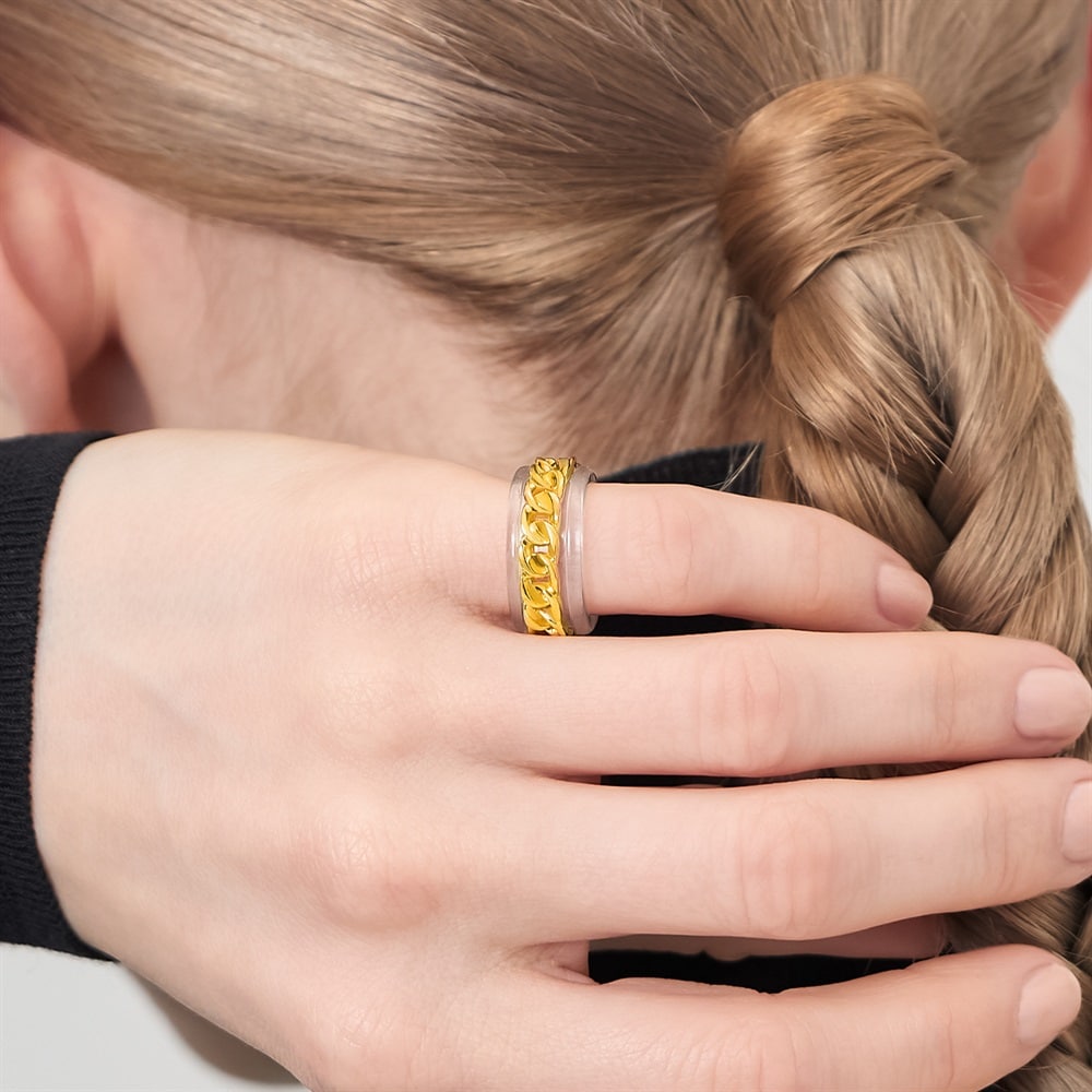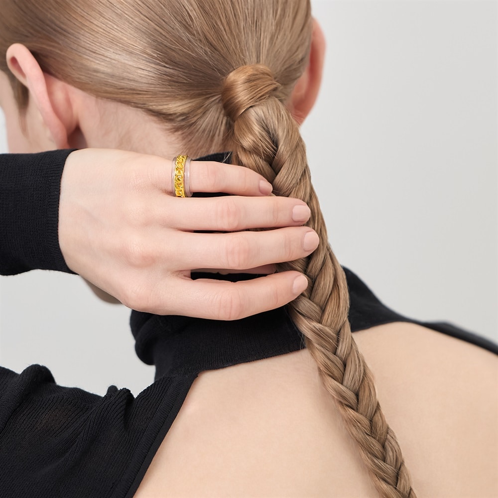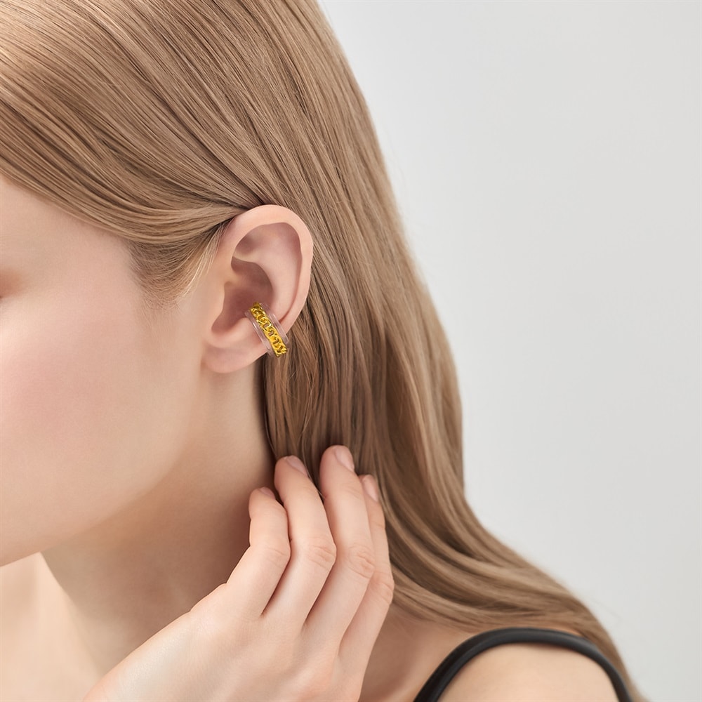 はみがき、着替え、今日のピアス -EAR FLOW-トレンドを纏い新しい自分に出会うセレクト-TREND LINE-透明感のあるクリア素材にリッチなゴールドチェーンが合わさった、モダンなカフリング。光を透過するクリアなフォルムはボリュームがありながらも軽やかな印象に。耳元に抜け感を生み出しつつ、ゴールドチェーンがスパイスとなって顔周りをスタイリッシュに引き締めます。ピンキーリングとしても身に着けられる2WAYアイテムです。※ボリューム(幅)のあるリングは、通常より着用時にサイズが小さく感じる場合がございます。※強い力が加わると変形する可能性がありますので、お取り扱いにはご注意ください。【同コレクションのアイテムはこちら】