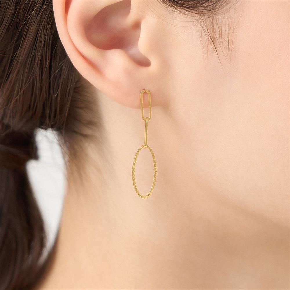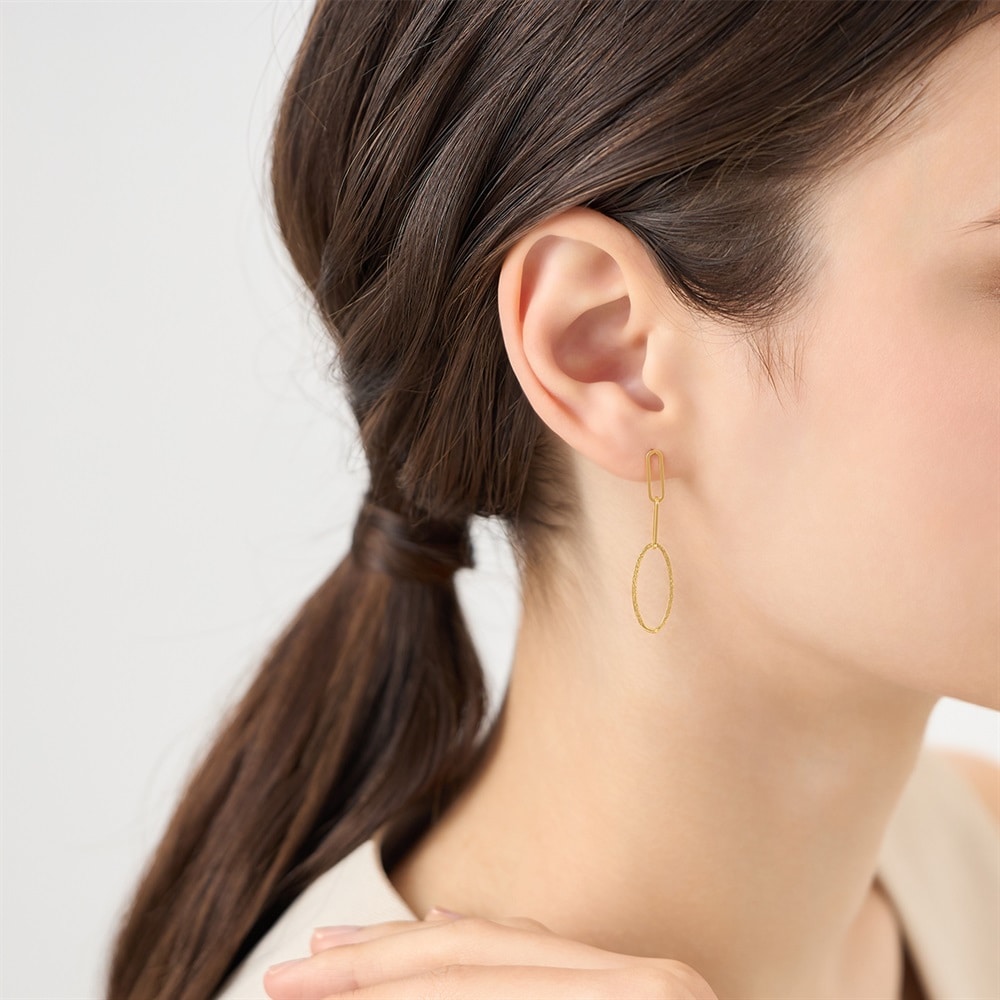はみがき、着替え、今日のピアス -EARFLOW-重ね着けを楽しむ洗練されたミニマルデザイン-LAYERING-異なる形状のパーツをリズミカルに繋ぎ合わせた、存在感のあるピアス。オーバルパーツにはテクスチャー加工がほどこされ、揺れるたびに輝きを放ちます。縦長のシルエットが顔周りをすっきりと見せ、大人らしい魅力を引き立ててくれるアイテムです。【同コレクションのアイテムはこちら】