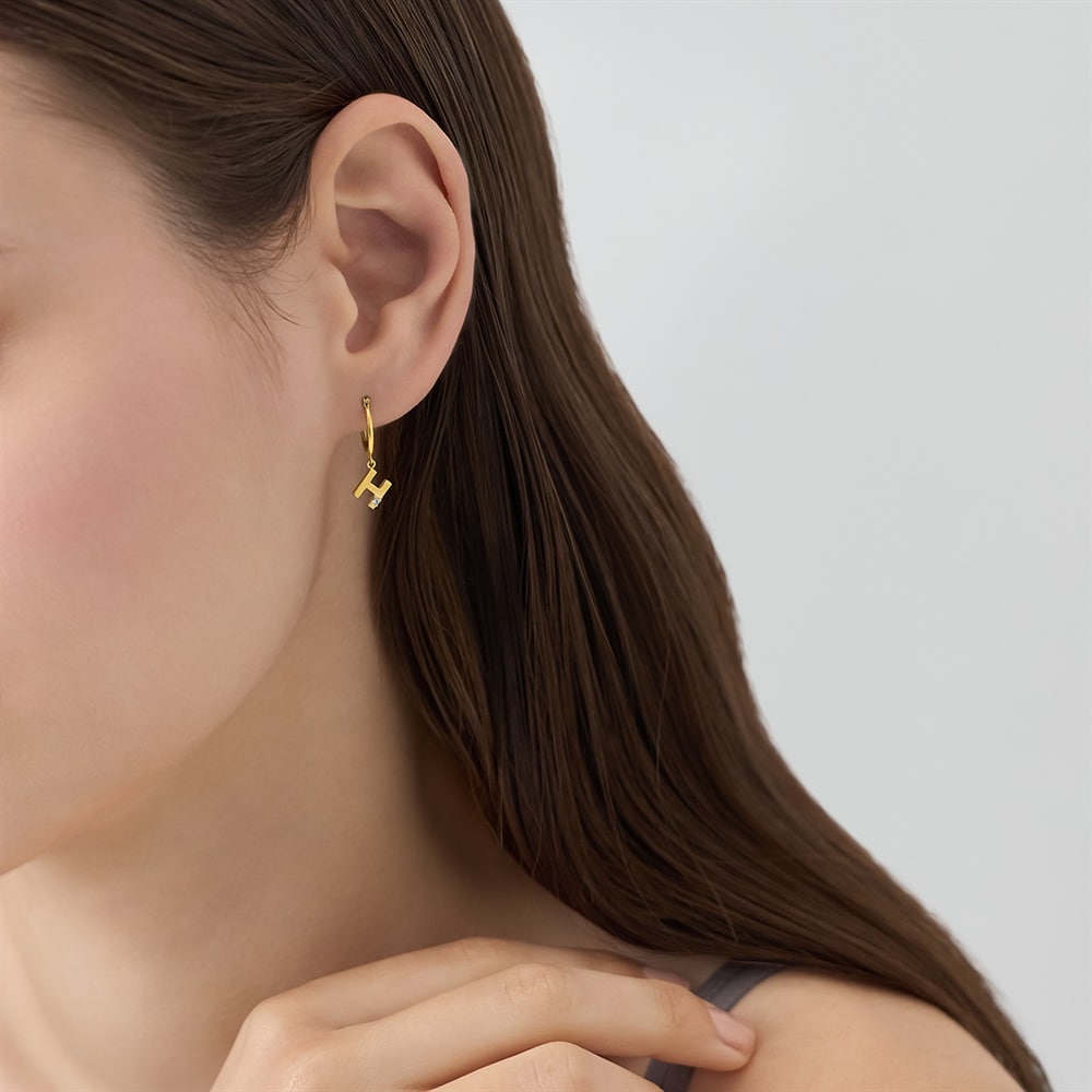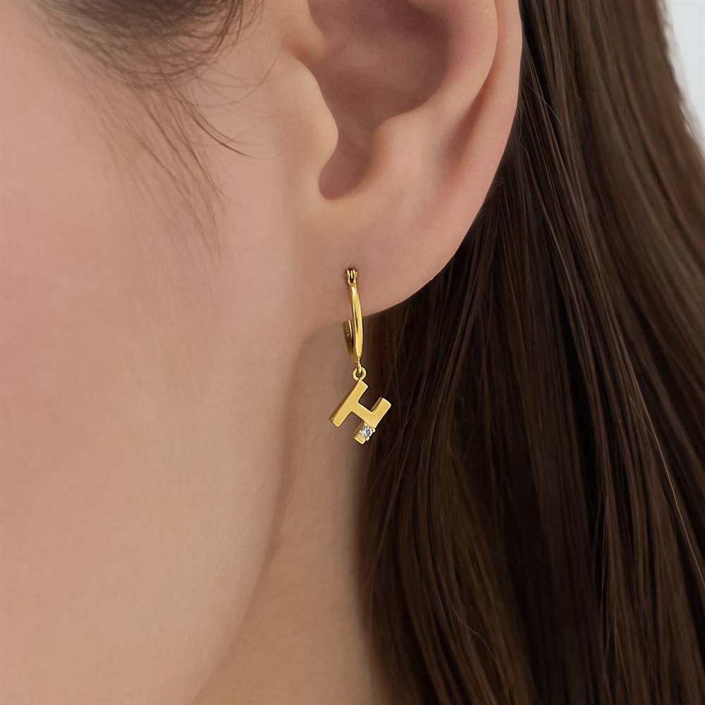 はみがき、着替え、今日のピアス -EARFLOW-自分仕様にカスタマイズ 選ぶ楽しさをその手に-CUSTOM FIT-ゴシック体のアルファベット「H」のチャームが揺れる、フープ型の片耳ピアスアルファベットが斜めに配されることで動きと抜け感が生まれ、顔周りにエレガントなアクセントをプラスします。片耳ずつ好きなイニシャルのピアスを選び、両耳でコーディネートするスタイルもおすすめです。【同コレクションのアイテムはこちら】
