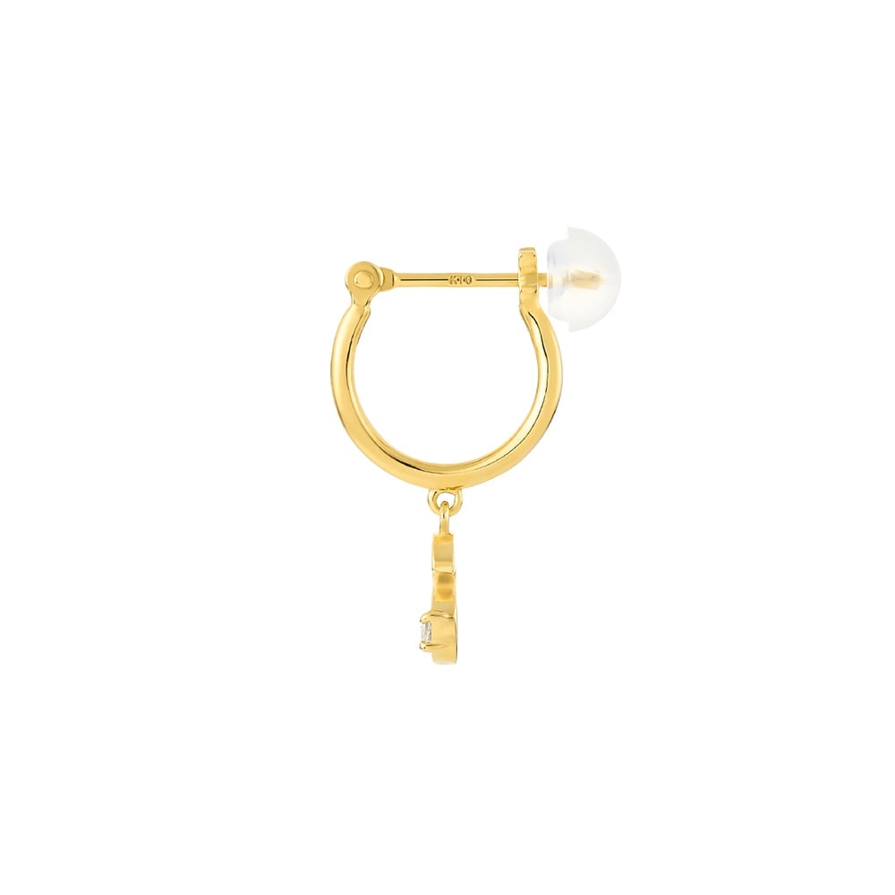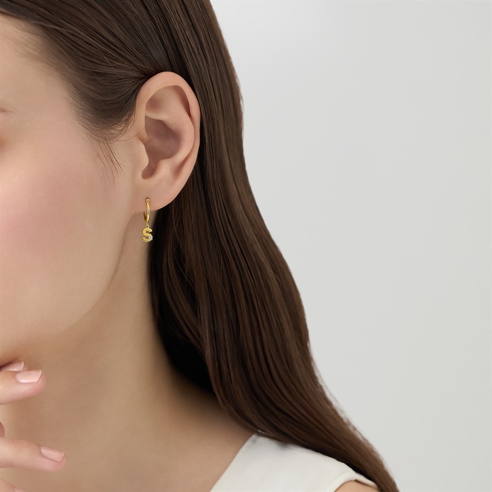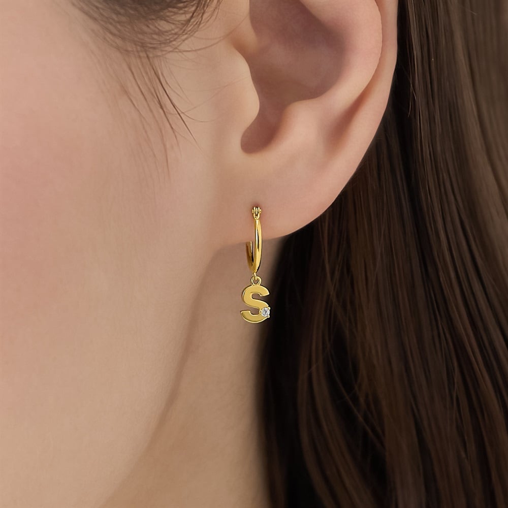 はみがき、着替え、今日のピアス -EARFLOW-自分仕様にカスタマイズ 選ぶ楽しさをその手に-CUSTOM FIT-ゴシック体のアルファベット「S」のチャームが揺れる、フープ型の片耳ピアス斜め下に配したキュービックジルコニアが動きに合わせてきらめき、顔周りをモダンに華やかに飾ります。片耳ずつ好きなイニシャルのピアスを選び、両耳でコーディネートするスタイルもおすすめです。【同コレクションのアイテムはこちら】