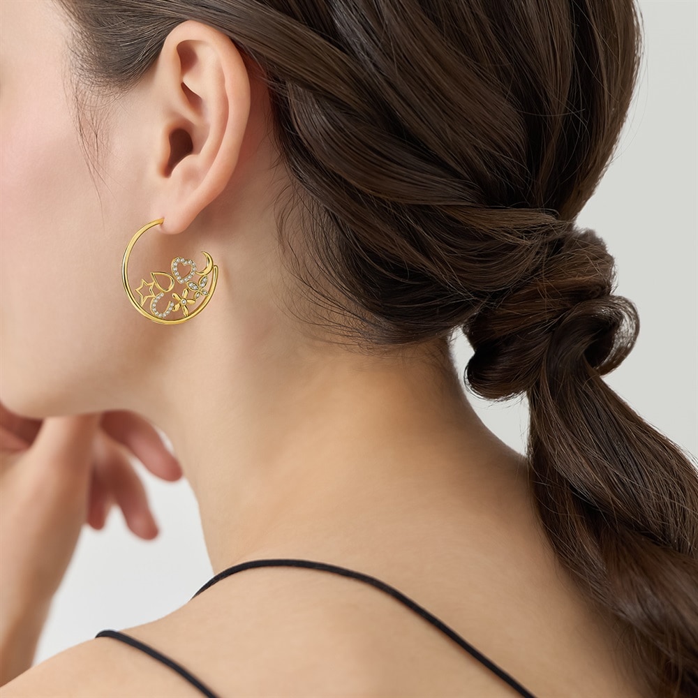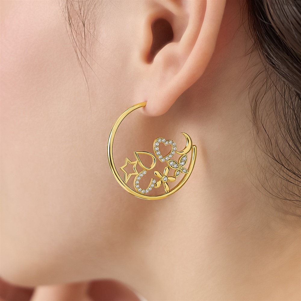 はみがき、着替え、今日のピアス -EARFLOW-カラーやモチーフでその日の気分をスイッチ-MOOD-星やハート、月などのラッキーモチーフを贅沢に詰め込んだ、大人の遊び心溢れるフープピアス。モチーフごとにフォルムやキュービックジルコニアの留め方を変え、さまざまな表情が楽しめるようバランスよく仕上げたデザイン。イエローゴールドカラーの華やかな輝きがいつものコーディネートをワンランク上の印象へと導きます。大ぶりなフープピアスは、小さなイヤーカフなどと重ねて片耳にポイントを置いたスタイリングもおすすめです。【同コレクションのアイテムはこちら】