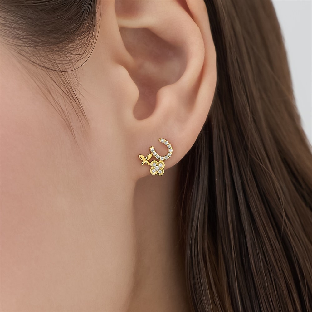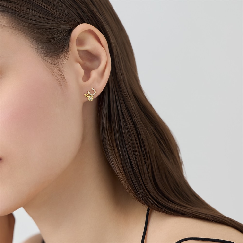 はみがき、着替え、今日のピアス -EARFLOW-カラーやモチーフでその日の気分をスイッチ-MOOD-幸運を受け止める「馬蹄」、美しく羽ばたく「蝶」、そして幸せを運ぶ「クローバー」のラッキーモチーフ3つが寄り添う、お守りピアス。耳元に収まる愛らしいサイズ感ながら、顔周りに上品な華やかさをプラスしてくれます。ご自身へのご褒美にもおすすめです。【同コレクションのアイテムはこちら】