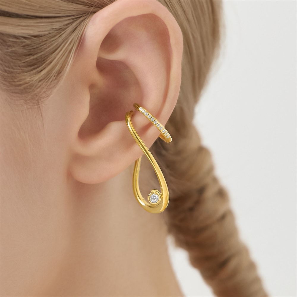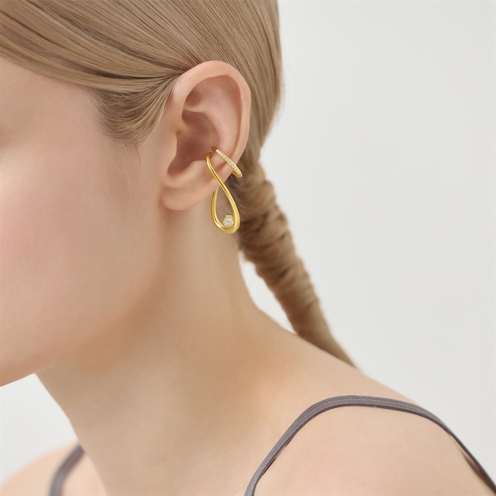 はみがき、着替え、今日のピアス -EARFLOW-毎日着けたいシンプルで合わせやすい定番-ESSENTIALS-ひとつ身に着けるだけでトレンド感のある装いを演出してくれる2連風イヤーカフ。やわらかな美しいラインに、運河の流れが包み込むようなデザインの石座をアクセントとして配置。イエローゴールドカラーの地金が肌になじみ、動くたびに光を反射して華麗に輝きます。存在感があるデザインながらも、顔周りをすっきりとした印象に見せてくれます。ひとつ着けるだけで普段の装いが洗練され日常使いからパーティーシーンまで、シーンを選ばずお使いいただけます。【同コレクションのアイテムはこちら】
