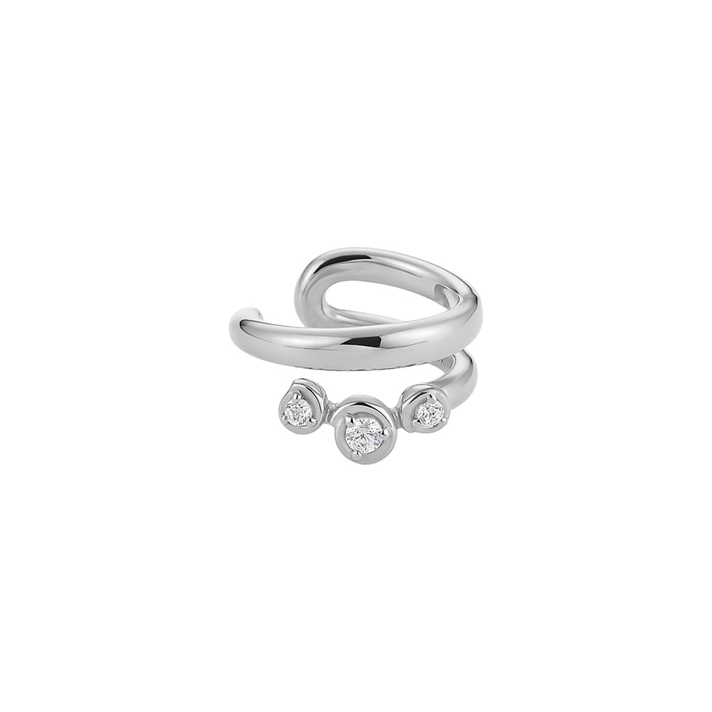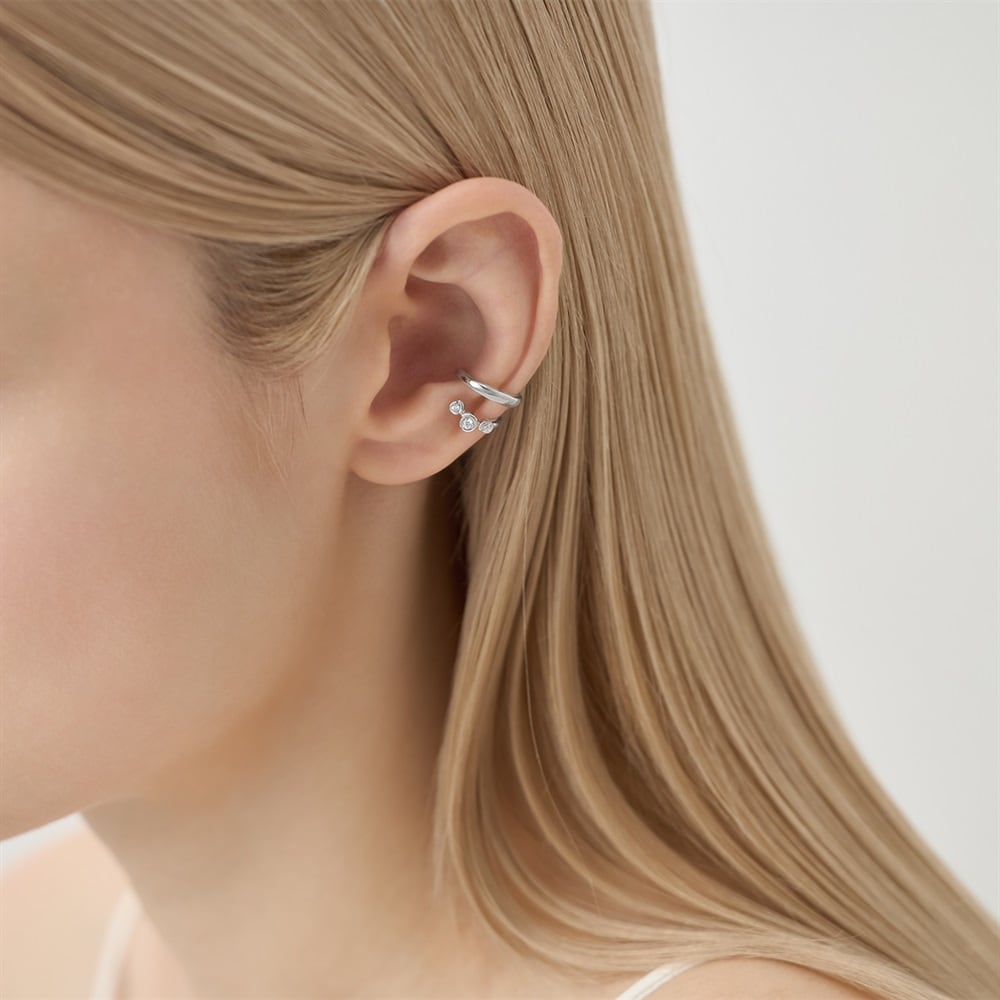 はみがき、着替え、今日のピアス -EARFLOW-毎日着けたいシンプルで合わせやすい定番-ESSENTIALS-リズミカルに配置された3石が耳元を華やかに演出してくれるイヤーカフ。運河の流れが包み込んでるようなデザインの石座がポイント。ロジウムコーティングが肌に溶け込むようになじみ、澄んだ光を反射して上品に輝きます。細部にこだわりシンプルながら存在感があり、コーディネートを品のある印象に仕上げてくれます。シーンを選ばずお使いいただけるデザインなので、ビジネスシーンや特別なデート、カジュアルな日常使いにもぴったりです。自分へのプレゼントはもちろん、大切な方への贈り物としてもおすすめです。【同コレクションのアイテムはこちら】
