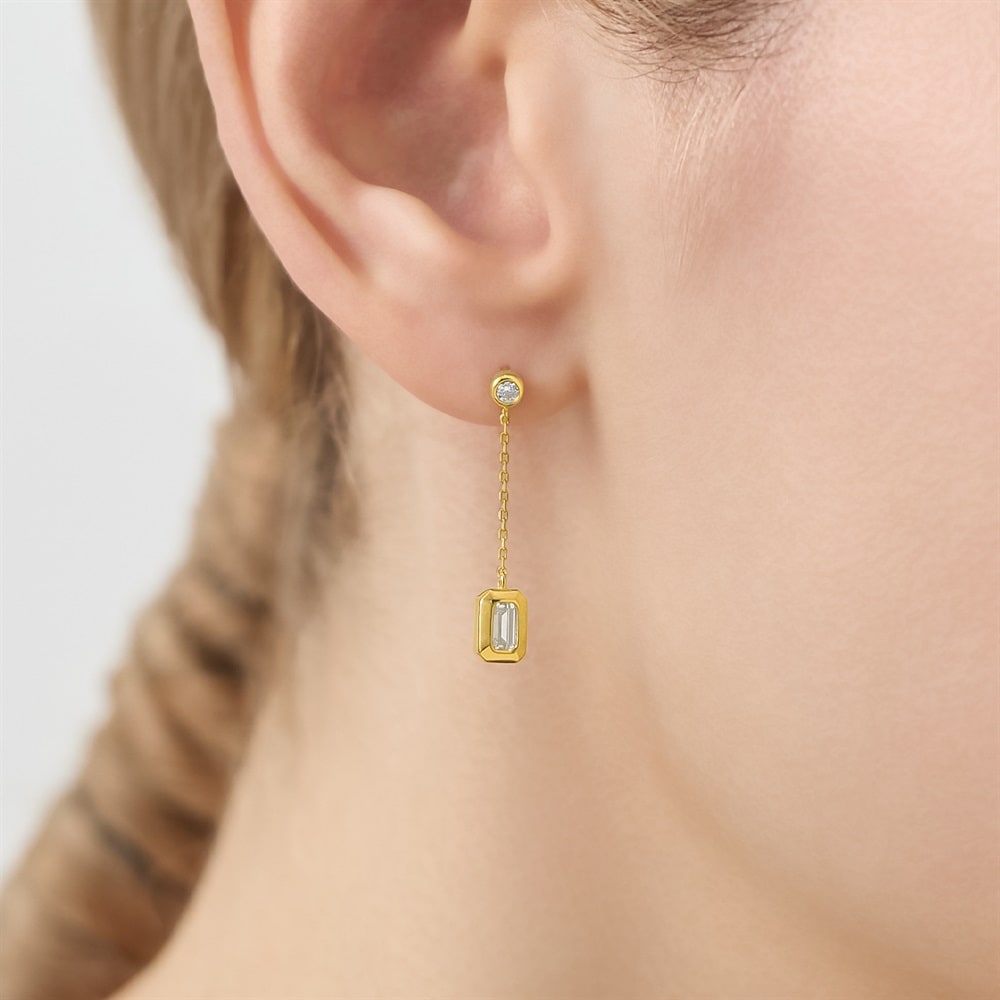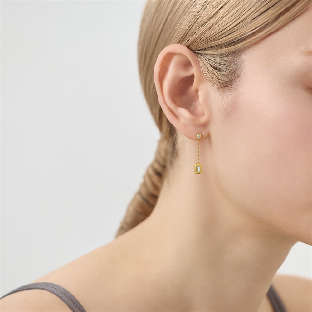 はみがき、着替え、今日のピアス -EARFLOW-毎日着けたいシンプルで合わせやすい定番-ESSENTIALS-上品に揺れるエメラルドカットのキュービックジルコニアがリュクスな雰囲気のチェーンピアス。イエローゴールドカラーが肌になじみ、動くたびに光を反射して華麗に輝きます。シンプルながら存在感があり、コーディネートを品のある印象に仕上げてくれます。シーンを選ばずお使いいただけるデザインなので、ビジネスシーンや特別なデート、カジュアルな日常使いにもぴったりです。自分へのプレゼントはもちろん、大切な方への贈り物としてもおすすめです。【同コレクションのアイテムはこちら】