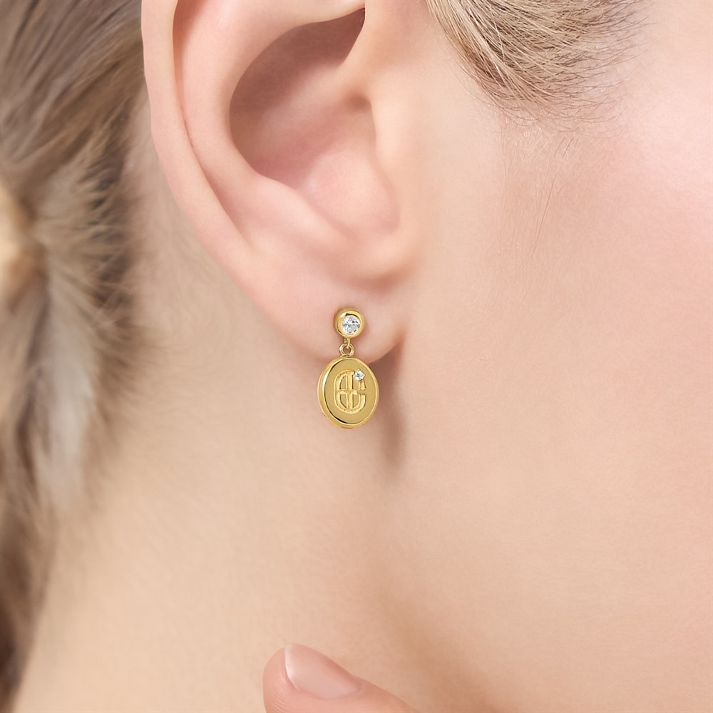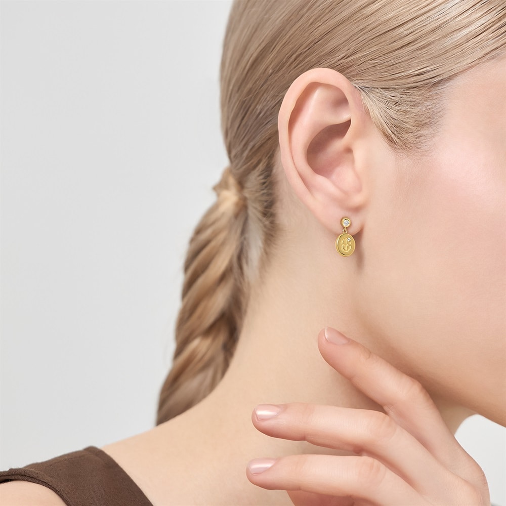 CANAL 4℃のシンボルマークを日常に寄り添うジュエリーとして表現したコレクション。艶やかなオーバルプレートのスイングピアス。やわらかなイエローゴールドカラーで仕上げ、キュービックジルコニアのきらめきを添えました。動くたびに上品に輝き、顔周りを華やかに演出します。【同コレクションのアイテムはこちら】