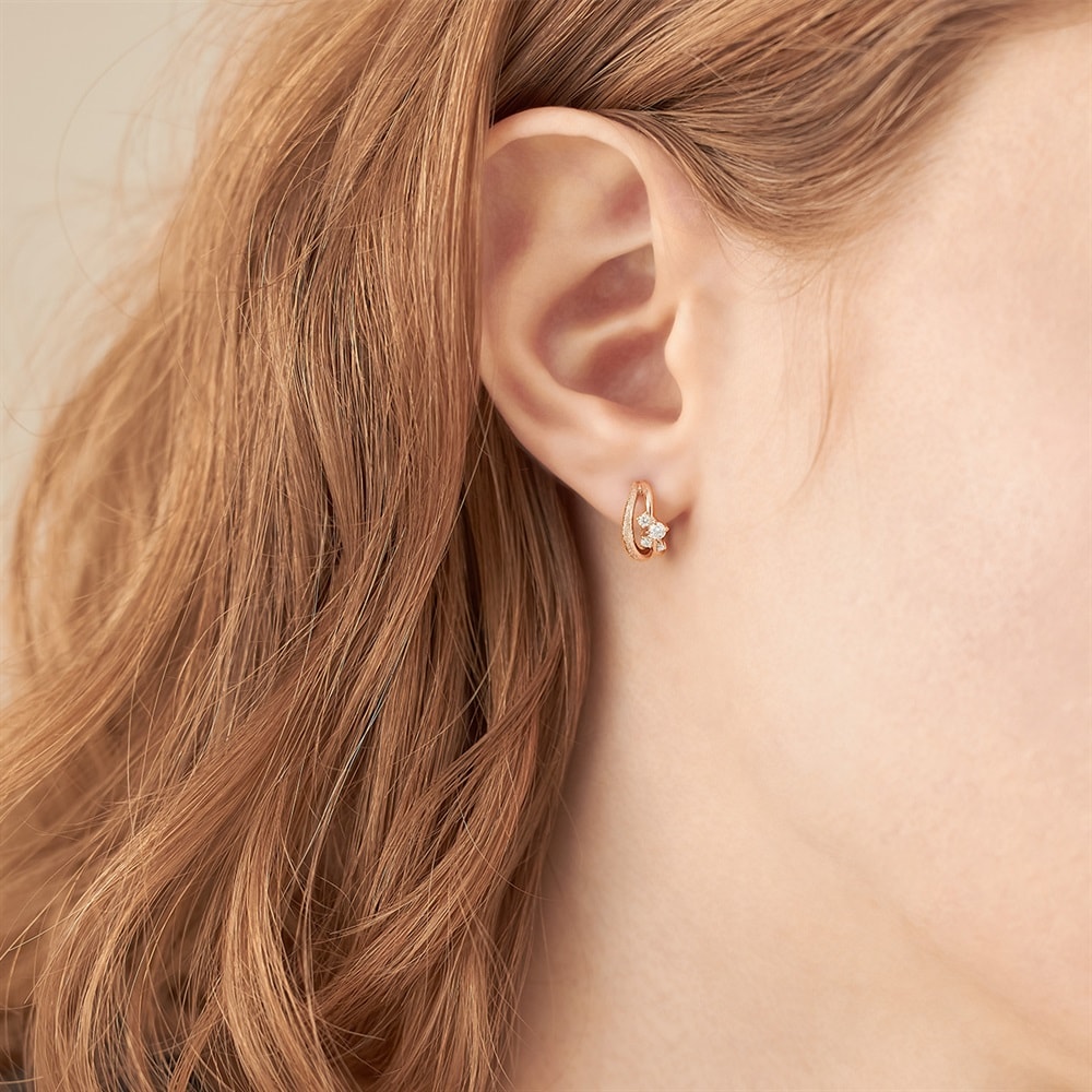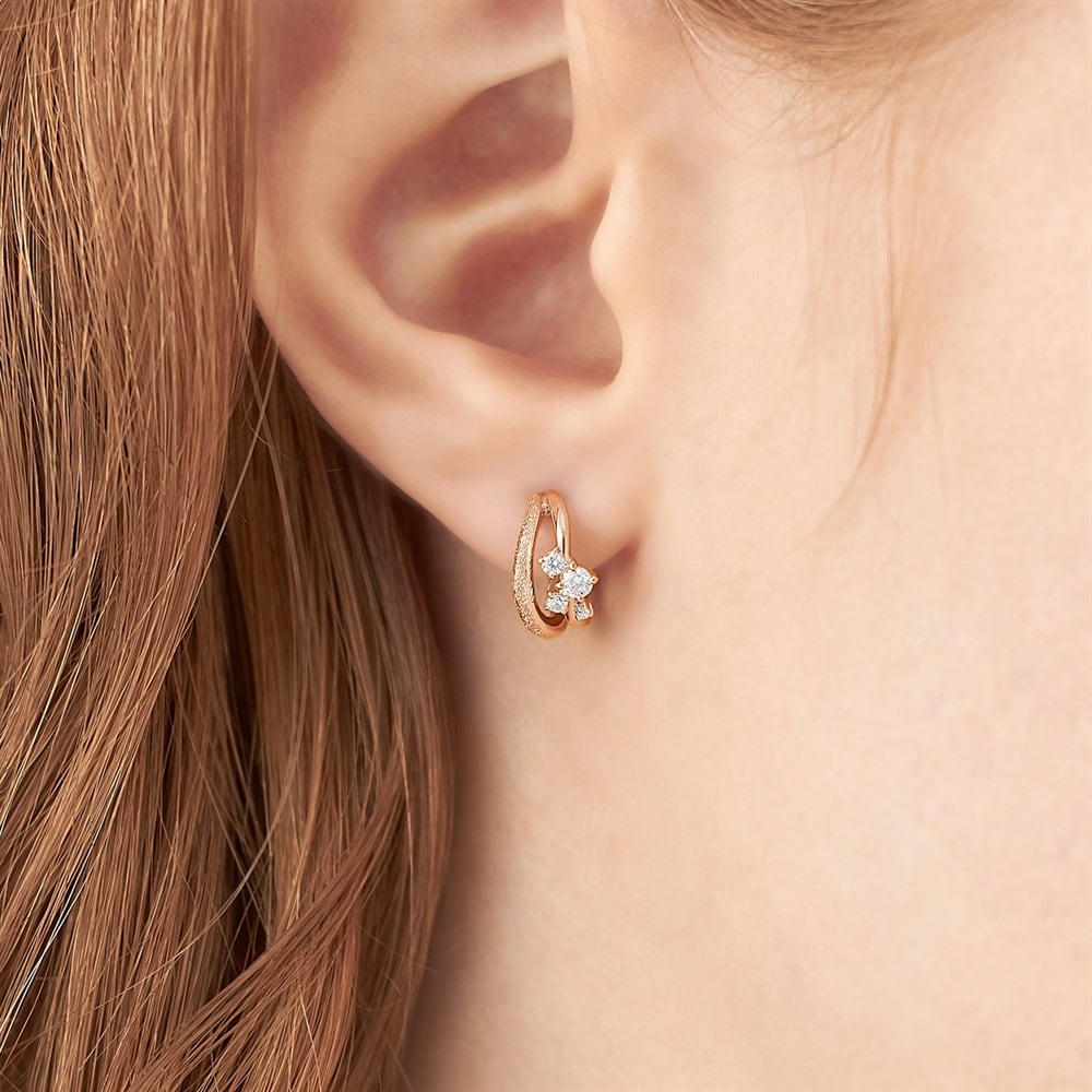 光り輝くダイヤモンドダストをあしらった -Diamond dust Collection-やわらかなダブルラインが耳を包むフープ風ピアス。ピンクゴールドカラーの輝きが、耳元に存在感をプラス。寄せ集まったストーンが上品にきらめきます。オンオフ問わず身に着けやすいサイズ感が魅力です。