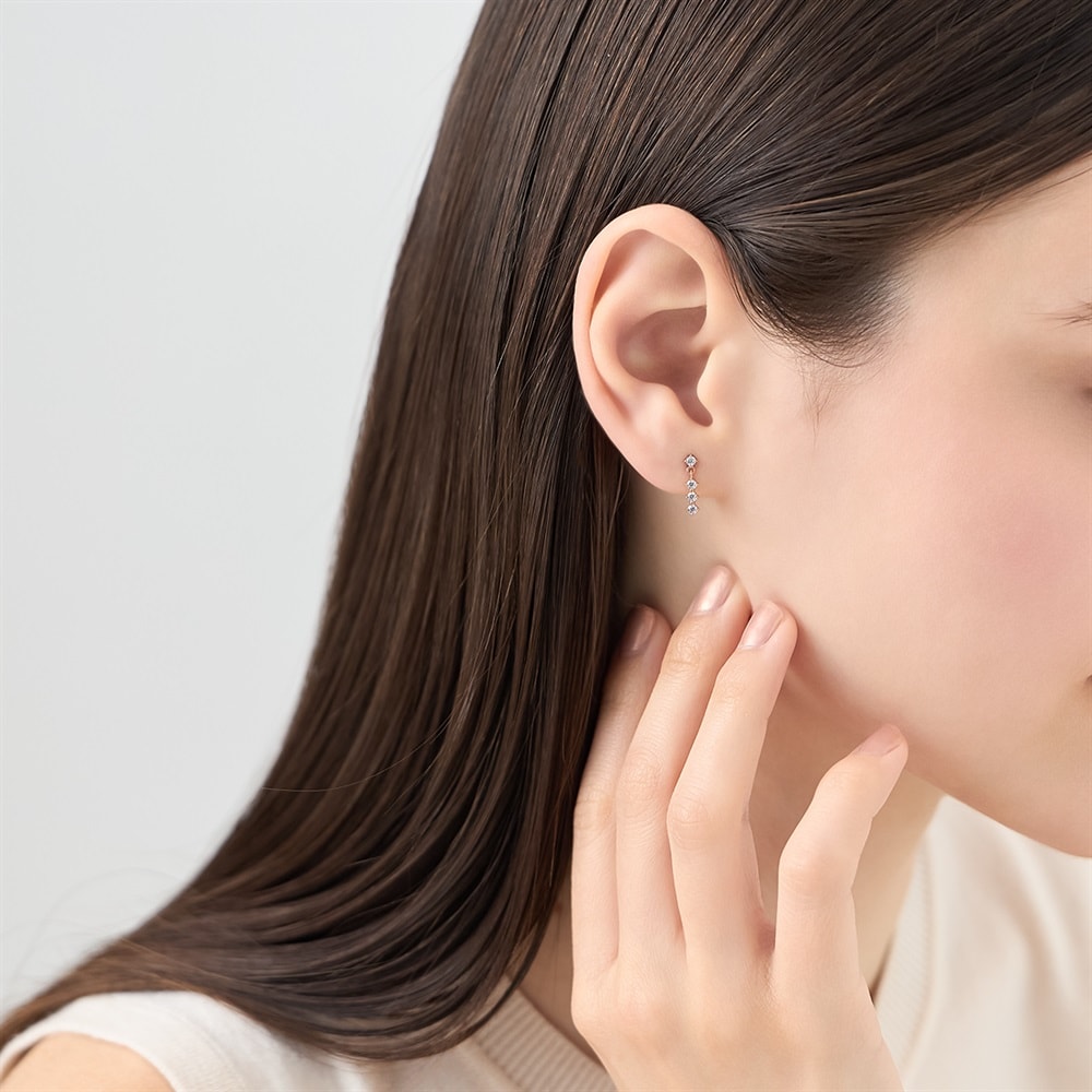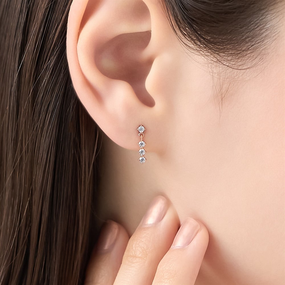 はみがき、着替え、今日のピアス -EARFLOW-毎日着けたいシンプルで合わせやすい定番-ESSENTIALS-縦に連なるキュービックジルコニアが、フェイスラインをすっきりとシャープに見せてくれるピンクゴールドカラーのピアス。スタイリッシュなデザインで、オフィスカジュアルのアクセントに最適です。トレンドに左右されないデザインは、自分へのご褒美にはもちろん、ギフトとしてもおすすめです。【同コレクションのアイテムはこちら】