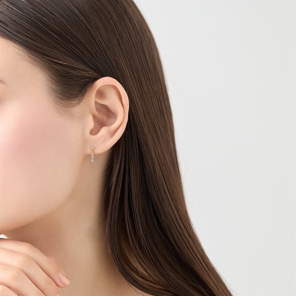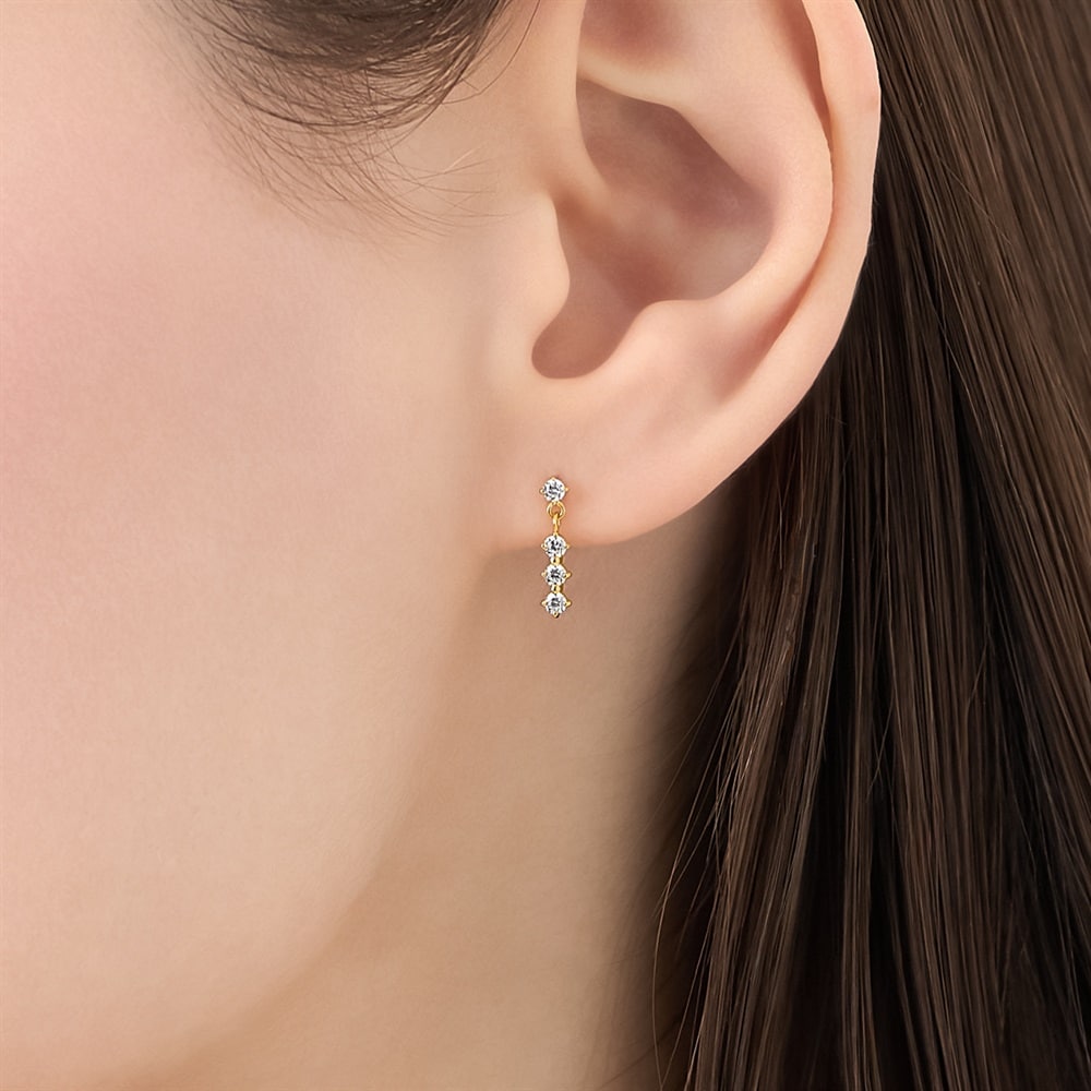 はみがき、着替え、今日のピアス -EARFLOW-毎日着けたいシンプルで合わせやすい定番-ESSENTIALS-縦に連なるキュービックジルコニアが、フェイスラインをすっきりとシャープに見せてくれるイエローゴールドカラーのピアス。スタイリッシュなデザインのため、オフィスカジュアルのアクセントに最適です。トレンドに左右されないデザインは、自分へのご褒美にはもちろん、ギフトとしてもおすすめです。【同コレクションのアイテムはこちら】